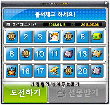 우선 출석체크기간이 2013.04.18일부터 2013.05.08일까지 되어 있는 부분은 오류입니다.
