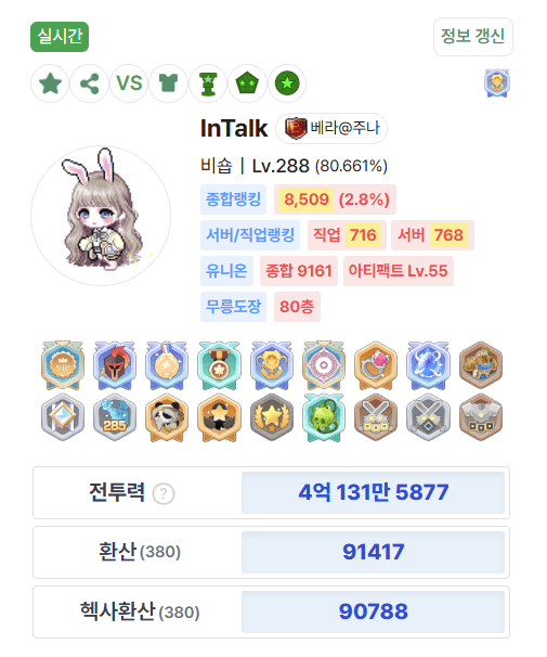 2중보약 + 블랙하트 + 칭호 + 전투복이라서 영끌환산이긴 한데 9만 찍히는 거 보면 신기하기두 하네요. 7만까진 쉬운 느낌이었고 8만이 진짜 쥰내 빡셌고 거기서 더 올릴 수 있을까 싶었는데 하다보니까 보약 거의 없어도 8.7 지금처럼 보약 많이 붙으면 9만이 찍히긴 하는 듯 근데 느끼는 게 솔직히 8만 때는 이정도면 고스펙 아닌가 싶었는데 9만을 찍고 나니까 아.. 9만도 그리 높은 건 아니구나.. 9.5~10만부터 고스펙 아닌가..? 여기서부터는 드는 액수가 다른 것 같은데,, 계산기를 정말 많이 돌려보니까, 열심히 하면 9.5~9.6만까지는 찍어볼 수 있을 것 같은데 (여름에 헥사스탯 하나 더 나오면 +1000) 10만은 도저히 못 찍을 것 같은데.. 하다보면 이 생각도 바뀔지도 모르겠지만 8만에서 9만이 벽으로 느껴진 것보다 훨씬 더 크게 벽이 느껴지긴 하네요.. |