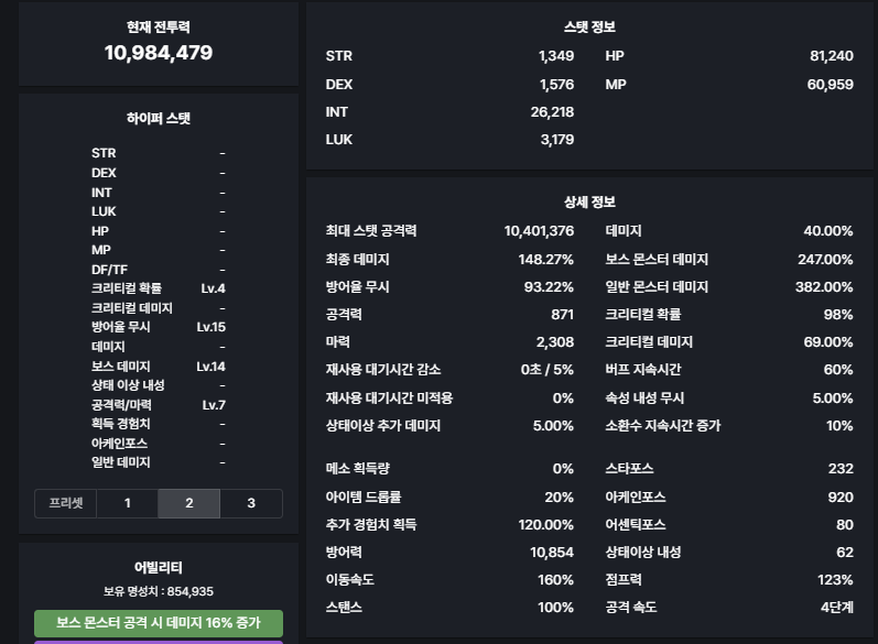 투력이 최소 5000만은 해야한다고 하더라구요... 근데 1000 > 5000 가려니... 뭘해야할지막막해서요.. 봐주실분 계신가여 아래는 제 템세팅이고. 수정하거나 내실다져야할게 있을까요? 서버는 챌섭이고 직업은 키네시스 레벨은 264입니다 일단 명큐는 40개정도 남았고 이벤링은 아직 레전잠재를 못사서 사면 이벤링명큐가 많이있어서 주텟 21퍼 달아주려합니다. 그 외에 나머지는 ... 막막하네유 ![]() ![]() ![]()
