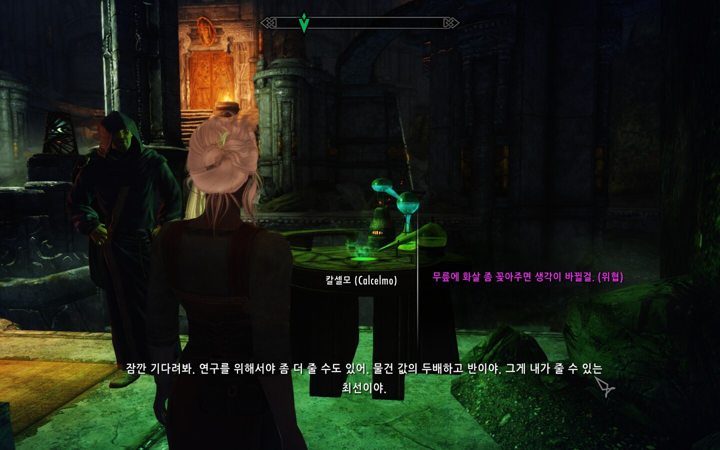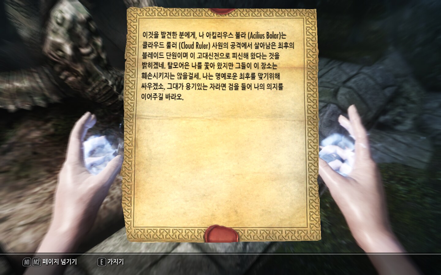 허씬 퀘스트를 받지 않는 상태에서 들어가면 탈로스 제단에 쪽지와 무기가 놓여져 있는 것을 찾을 수 있습니다. (허씬 퀘스트를 받더라도 특정분기를 선택하고 게임시간 30일 지난 후에 찾을 수 있다고 함.)