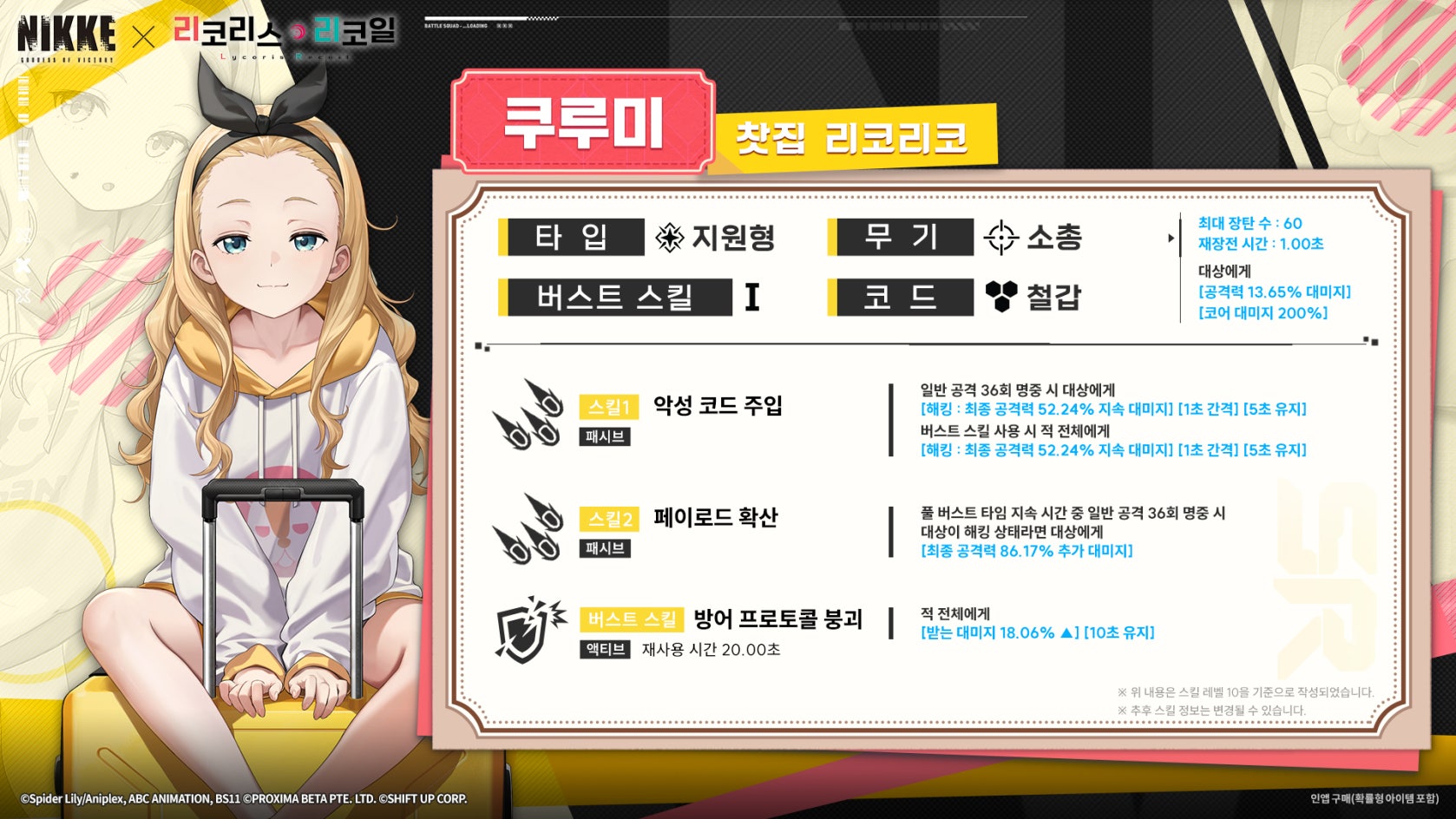 3. 쿠루미(Kurumi) - 최강의 해커 월넛, SR 캐릭터 [쿠루미]가 합류합니다. - 지속 대미지를 이용해 적에게 피해를 입히는 지원형 캐릭터입니다. [버스트 스킬 사용에 따른 효과] - 다수의 적에게 받는 대미지를 증가시킵니다. ▶ 클래스 : 지원형 ▶ 사용 무기 : 해커용 원격 드론(AR) ▶ 코드 : 철갑 ▶ 소속 진영 : 어브노멀 ▶ 획득 기간 : 2026년 2월 12일(목) 점검 완료 후 ~ 2026년 3월 12일(목) 4:59:59 - [쿠루미]는 리코리스 리코일 콜라보 이벤트 Lie cause Recoil에서 획득할 수 있습니다. 구체적인 획득 방법은 아래 대형 콜라보 이벤트 안내에서 확인하실 수 있습니다. - 콜라보 이벤트 기간 종료 이후, [쿠루미]는 일반 모집, 신규 지휘관 전용 모집, 일반 모집(튜토리얼), 소셜 포인트 모집, 몰드 아이템, 마일리지 상점을 통해 모집할 수 없습니다.