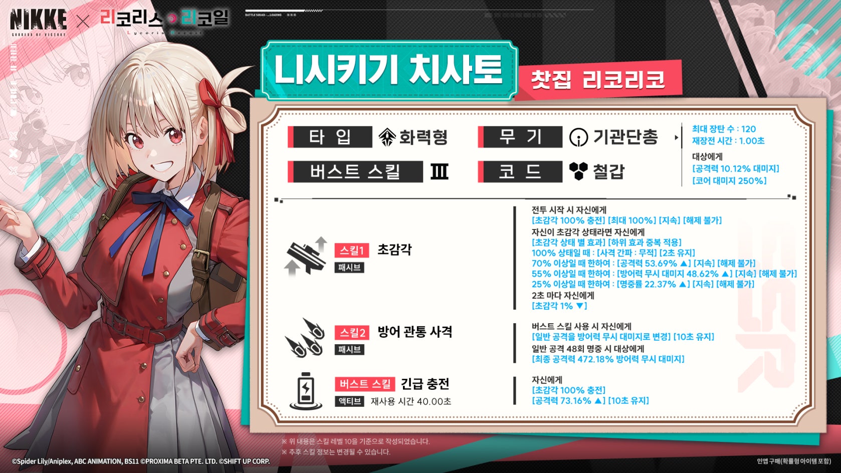 1. 니시키기 치사토(Nishikigi Chisato) - 역대 최강의 리코리스이자 찻집 리코리코의 자칭 간판 마스코트, SSR 캐릭터 [니시키기 치사토]가 기간 한정 모집에 합류합니다. - 자신의 상태에 따라 공격 능력이 변경되는 화력형 캐릭터입니다.