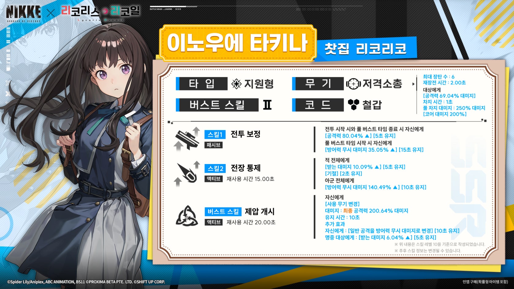 2. 이노우에 타키나(Inoue Takina) - 우수한 리코리스이자 찻집 리코리코에서 일하고 있는, SSR 캐릭터 [이노우에 타키나]가 기간 한정 모집에 합류합니다. - 주기적으로 아군의 공격 능력을 강화하고, 적의 방어 능력을 약화시키는 지원형 캐릭터입니다.