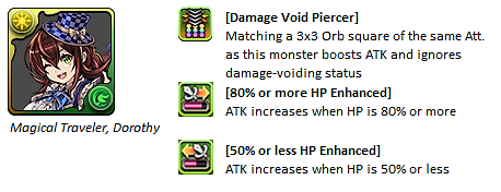 북미, 도로시 강림 등장!![]() 기간 (UTC-8, 북미 시간 기준) : 6월 27일 17:30 ~ 7월 4일 11:59 이전까지 공개되지 않았던 강림 던전인 도로시 강림이 북미 서버에 등장합니다! 미국의 소설가 L. Frank Baum이 1900년대에 쓴 '오즈의 마법사'의 도로시가 퍼즐&드래곤 모험에 도전으로 등장합니다. 여러분은 그녀를 이기기 위한 용기, 친절, 지혜를 가지고 있나요? 도로시 강림은 '파멸급', '초절지옥급', '초지옥급'으로 구성되어 있으며, 다양한 몬스터들이 등장합니다. 또한, 보스로는 '마법의 모험가 도로시'가 등장합니다. 그리고 같은 기간 동안 3인 협력 던전을 통해서도 도로시 강림에 도전할 수 있습니다. 또한, 도로시 강림이 생방송에도 등장합니다! 북미 시간 기준 6월 27일 17시에 트위치에서 진행하는 스트리밍을 통해서 스페셜 게스트와 함께 해당 던전에 도전해봅니다. ★ 이벤트 기간 동안 도로시 강림을 최초 클리어 할 경우 보상을 받을 수 있습니다. 모든 층을 클리어 시 : 마법석 10개 파멸급 클리어 시 : 이벤트 메달 [무지개] 초절지옥급 클리어 시 : 다이아 드래곤 후르츠 초지옥급 클리어 시 : 6주년 기념 타마도라 ※ 이벤트 기간 외에 해당 던전을 최초 클리어 할 경우 보상을 받을 수 없습니다. ※ 3인 협력 던전에서는 해당 보상이 주어지지 않습니다. ★ 신규 휘석이 추가됩니다. 북미 시간 기준 6월 27일 17:30 이후부터 마법의 여행가 도로시의 휘석이 새롭게 추가됩니다. - 몬스터 상세사항 ![]() 스킬 : '멋진 일이 생겨날거에요' 리더스킬 : 빛속성의 공격력과 회복력이 2배. 받는 대미지를 가끔 반감한다 4콤보 이상일때 공격력이 상승, 최대 10배 ![]() ![]() ※ 어시스트 진화체