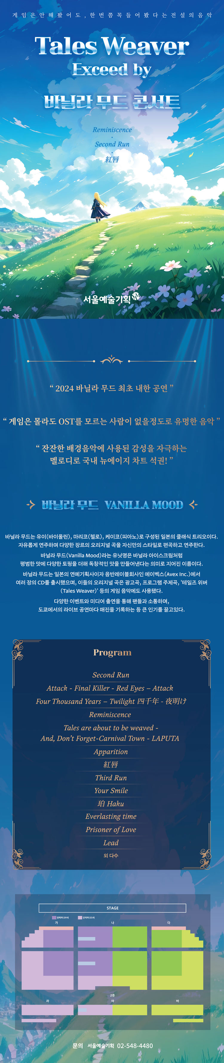 바닐라 무드(Vanilla Mood)의 테일즈 위버 ost 내한공연공연내용 : 테일즈 위버 ost인 Tales Weaver Exceed by Vanilla Mood 앨범외 다수 공연일시 : 2024년 7월 10일 (수) 오후 7시 30분 공연장소 : 용산아트홀 대극장 미르 티켓예매 : 인터파크 티켓, 네이버 예약 네이버 예약(비지정석) 공지사항EVENT 1 : 서울예술기획 인스타그램 팔로워 할인 20% * 서울예술기획 인스타그램(https://www.instagram.com/seoularts_sam/) 팔로우하시면 20% 할인적용됩니다. * 당일 티켓 수령시 팔로워 인증해주셔야하며, 인증이 불가능 할 시에는 차액이 부과될 수 있음을 알려드립니다. * 티켓은 1인 2매까지 구매 가능하시며, 한 분만 인증해주셔도 관람 가능하십니다. EVENT 2 : 기대평 작성 이벤트 * 공연에 대한 기대평을 작성해주시면 추첨을 통해 5분께 '바닐라 무드 싸인 포스터' 를 드립니다! * 기대평 작성 후 반드시 서울예술기획 인스타그램으로 예매내역과 기대평을 캡쳐해서 DM주셔야 응모됩니다. * 당첨자는 개별통보됩니다. 할인정보 - 서울예술기획 인스타그램 팔로워 할인 20% 바닐라무드의 테일즈위버 OST 모음집 공연포스터 ![]()