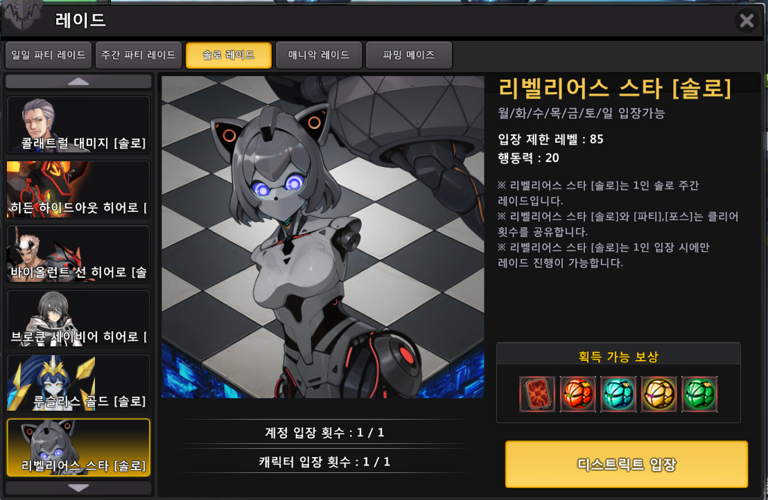 [어둠에 봉인된 마탄] - 익시드 드라이버 [추적] 사용시 강화된 [추적] 사용 [카스파르의 마탄] - 익시드 드라이버 [추적] 사용시 더욱 강화된 [추적] 사용 ■ ‘리벨리어스 스타’ 레이드 [솔로] 업데이트 - ‘리벨리어스 스타’ 레이드 솔로(1인) 모드가 업데이트됩니다. ![]() - 레이드 UI를 통해서만 입장이 가능합니다. ![]() 1) 입장 조건 - 레벨 85 이상 캐릭터 (1인 입장 가능) - 클리어 시 횟수 차감 및 행동력 20이 소모됩니다. - 주간 1회 무료 입장이 가능합니다. - 소울 리텐션 700 이상 입장 가능합니다. 2) 레이드 특징 - 계정당 주간 1회까지 클리어 보상을 획득할 수 있습니다. - 메이즈 내 아이템 획득 시 드랍률 버프 영향을 받습니다. - 부활 수 제한이 4 회로 제한 됩니다. - '[허가증] 리벨리어스 스타'는 [솔로], [파티], [포스] 모두 사용 가능하며 각 모드는 클리어 횟수를 공유합니다. 3) 보상 - 레이드 클리어 시 아이템 / 경험치를 획득합니다.