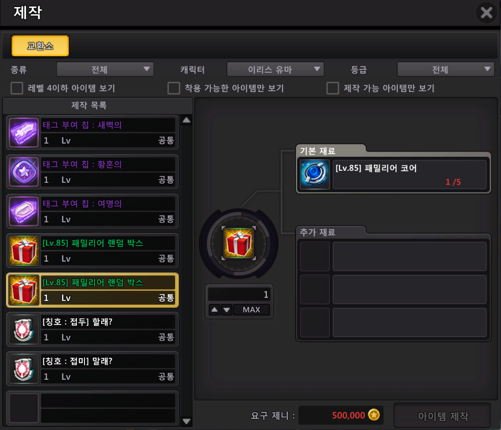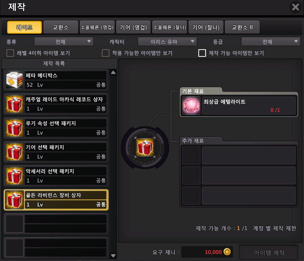 ■ 골든 라비린스 자유변환 장비 업데이트 - 자유롭게 변환할 수 있는 [골든 라비린스 장비 상자]가 업데이트 됩니다. - <NPC 이오 - 제작>탭을 통해 계정 별 1회 제작이 가능합니다. ![]() - [골든 라비린스 장비 상자]는 아래 세 가지 패키지 중 하나를 선택하여 획득 가능합니다. 1. 무기 속성 선택 패키지 - 황금 또는 어둠 무기 중 1가지 선택이 가능합니다. 2. 기어 선택 패키지 - 침식, 사념, 침묵, 갈망, 집념 중 1가지 선택 후 헤드/숄더/바디/레그 종류 선택이 가능합니다. 3. 악세서리 선택 패키지 - 로스카, 켄트, 이오 중 1가지 선택 후 이어링/팬던트/링 종류 선택이 가능합니다. ※ 패키지 및 장비 상자는 은행 입고가 가능하며, 사용하여 획득한 장비는 은행 입고가 불가능합니다. ※ 패키지 및 장비 상자를 통해 획득한 모든 장비는 태그가 부여됩니다. ※ 악세서리를 제외한 장비는 소켓 아이템 장착이 가능하며, 강화 9단계 및 랜덤 옵션이 설정되어 있습니다. ※ 설정된 랜덤 옵션은 최댓값으로 제련 시 다른 값으로 변경 되지 않습니다. - 해당 상자에서 선택한 장비는 분해 시, ‘특수 장비 변환제’ 1개를 획득할 수 있으며 <NPC 이오 - 제작>탭을 통해 다시 세 가지 패키지로 제작이 가능합니다. - ‘특수 장비 변환제’를 통한 패키지 제작은 제한이 없으며 제작 시 1,000,000 제니가 소모됩니다. ■ 성순 분해 및 제작 추가 ![]() - 85레벨 일반 성순 분해 시, ‘[LV.85] 패밀리어 코어’ 1개를 획득할 수 있습니다. ![]() - ‘[LV.85] 패밀리어 코어’ 는 에셀드레다 <NPC 러그만 - 제작>을 통해 ‘[LV.85] 패밀리어 랜덤 박스’로 제작이 가능합니다. ![]() - ‘[LV.85] 패밀리어 랜덤 박스’ 제작 시, ‘[LV.85] 패밀리어 코어’ 5개 및 500,000 제니가 소모됩니다. ※ 해당 랜덤 박스는 광휘의 조각 파편 및 레이드 코인으로 제작하는 기존 아이템과 동일합니다. ■ 기타 - ‘페타 브로치: 소울 런처’ 거래소 등록 시 아이템 설명이 잘못 표시되는 문제가 수정됩니다. - 코스튬 봉인 횟수가 무제한 시 undefined 로 표기되는 문제가 수정됩니다. - 소울스톤 데미지가 정상적으로 적용되지 않는 문제가 수정됩니다. - 치이 [라스트오리진] 이터니티 코스튬 착용 후 스킬 사용 시 그래픽이 깨지는 문제가 수정됩니다. 위 업데이트 내용은 내부 사정에 따라 일부 변경되거나 추가될 수 있는 점 참고 부탁드리며, 더욱 만족스러운 서비스 제공을 위해 언제나 최선을 다하겠습니다. 감사합니다. ![]() |