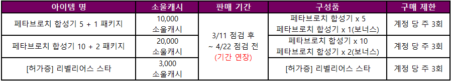 [안내] 4월 8일(수) 업데이트 노트 안내 (추가)![]() 안녕하세요. 소울워커입니다. 4월 8일(수) 업데이트 적용을 위한 정기 점검이 진행 될 예정입니다. 아래 내용을 참고하셔서 게임 이용에 불편 없으시길 바랍니다. ■ 점검 일시 2026년 4월 8일(수) 08:50 ~ 17:00 ■ 점검 내용 4월 8일(수) 업데이트 노트 ■ 점검 보상 - 럭키데이 Z [30분] 2개 - 극고농축 비타민 Z 2개 - 황금색 욕망의 잔류물 항아리 2개 - 에너지 컨버터 8개 ※ 점검 보상은 4월 9일(목) 23:59 까지 수령 가능합니다. ■ 주의 사항 ※ 점검 시간 중 게임에 접속하실 수 없습니다. ※ 점검 일정은 내부 사정에 따라 변경될 수 있습니다. ※ 플레이 중 점검이 시작되어 소모된 행동력 및 버프 아이템 등은 복구에 도움을 드리기 어려운 점 양해 부탁 드립니다. 감사합니다. ![]() ![]() 안녕하세요. 소울워커입니다. 2026년 4월 8일(수)에 적용되는 업데이트 내용을 안내 드립니다. ┃ 업데이트 내용┃ ■ 이리스 2차 승급 [후속 패치] - 이리스 2차 승급 업데이트에 대한 후속 편의성 패치가 진행됩니다. 1. ‘어썰트 다이브 [분쇄]’ 사용 시 좌클릭 홀드로 변경됩니다. 2. ‘풀 버스트 [초고출력]’ 3단계 차징 도달 시 즉시 사용 되도록 변경됩니다. 3. ‘펄스파이어 [파워샷]’ 2단계 차징 도달 시 즉시 사용 되도록 변경됩니다. 4. '오퍼레이션 애쉬즈' 사용 시 후딜레이가 감소됩니다. (4/7 18:48 추가) ■ 기타 - 모든 랭킹 메이즈에 대한 클리어 보상이 0 제니로 변경됩니다. - 아래 메이즈 입장권의 구매 가격이 1 제니로 변경됩니다. 1. [워프 오브] 요르하카 도전권 2. [워프 오브] 라파쿰바 도전권 3. [워프 오브] 플레마 도전권 4. [워프 오브] 테네브리스 도전권 5. [랭킹] 페르드랑스 도전권 6. [랭킹] 콜래트럴 대미지 도전권 7. [랭킹] 히든 하이드 아웃 히어로 도전권 ※ 4월 8일(수) 업데이트 이전 해당 아이템을 구매하여 보유 중인 수량에 대해서는 1:1 문의를 통해 환불 요청 시 아이템 회수 후 기존 가격인 50,000 제니로 지급 도움 드릴 수 있도록 하겠습니다. (4/7 18:48 추가) ┃ 캐시샵 추가 상품 안내 - 기간 ┃ - 이벤트 기간: 2026년 04월 08일(수) 점검 후부터 2026년 04월 22일(수) 점검 전 까지 ▶ 캐시샵 상품 - 판매 기간 연장 ![]() ▶ 코스튬 상시 할인 판매 종료 3차 상시 할인 판매 중인 코스튬 할인 판매가 종료됩니다. 아래 코스튬 가격이 점검 이후 기존 가격으로 변경됩니다. [상시 할인 판매 종료 리스트 3차 4/8] 1. 서큐버스 인 나이트 메어 2. 붉은 달의 전야제 3. 고스트 생츄어리 4. 서리의 지배자 5. 조이풀 윈터스키웨어 6. 러블리 크리스마스 7. 미니멀 스프링 8. 트릭 오어 트리트 ┃ 픽업 전송 안내 ┃ - 픽업 전송은 2026년 04월 08일(수) 점검 후부터 2026년 05월 06일(수) 점검 전 까지 이용 가능합니다. ▶ 코어 아카식 러그만 픽업 전송 - 아카식 레코드 러그만 획득 확률이 증가한 픽업 전송이 추가됩니다.∴ 5성 출현 시 50% 확률로 러그만 획득 가능 - 픽업 전송에서는 일일 1회 무료뽑기가 진행되지 않습니다. 위 업데이트 내용은 내부 사정에 따라 일부 변경되거나 추가될 수 있는 점 참고 부탁드리며, 더욱 만족스러운 서비스 제공을 위해 언제나 최선을 다하겠습니다. 감사합니다. ![]() |
