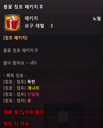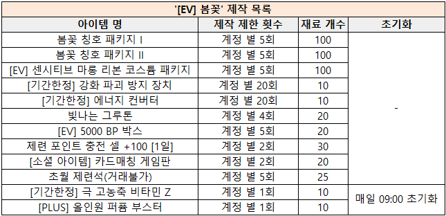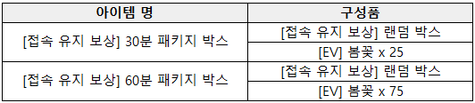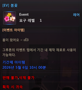 [이벤트] 봄이 왔나봄 이벤트 안내![]() 안녕하세요, 소울워커입니다. 2026년 04월 08일(수) 업데이트 되는 인게임 이벤트를 안내드립니다. ▶ 봄이 왔나봄 이벤트 안내 1) 이벤트 기간 - 2026년 04월 08일(수) 점검 후 ~ 2026년 05월 06일(수) 점검 전까지 2) 이벤트 안내 - 접속 유지 보상을 통해 ‘[EV]봄꽃’ 아이템을 획득할 수 있으며, 해당 아이템으로 NPC 그루톤 상점 내 "이벤트" 탭에서 다양한 아이템으로 교환할 수 있습니다. ![]() - '[EV]봄꽃'과 [기간 한정] 아이템은 05월 06일 점검 전까지 사용할 수 있으며 사용 가능 기간이 지나면 자동 삭제됩니다. ![]() [EV] 봄꽃 < 이벤트 제작 목록 > ![]() ![]() [EV] 센시티브 마롱 리본 코스튬 패키지 - 센시티브 마롱 리본 ![]() 봄꽃 칭호 패키지 I - [칭호 : 접두] 봄이, [칭호 : 접미] 왔나봄 ![]() 봄꽃 칭호 패키지 II - [칭호 : 접두] 목련/개나리/진달래, [칭호 : 접미] 꽃 감사합니다. ![]() |