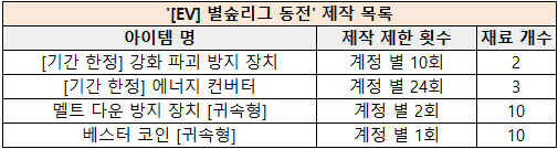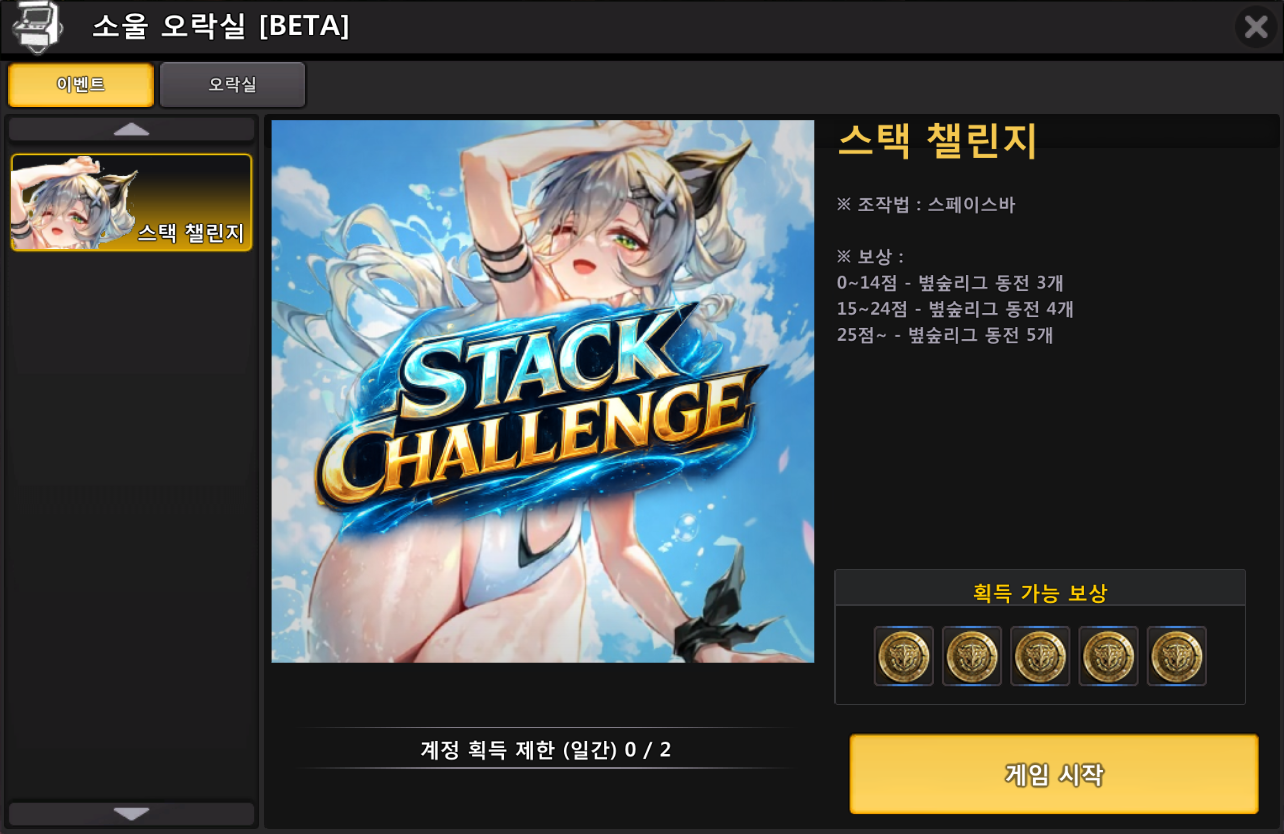 [이벤트] 소울 오락실 BETA ‘스택 챌린지’ 이벤트![]() 안녕하세요. 소울워커입니다. 2026년 04월 08일(수) 업데이트 되는 인게임 이벤트를 안내드립니다. ■ 소울 오락실 BETA ‘스택 챌린지’ 이벤트 ![]() 1) 이벤트 기간 - 2026년 04월 08일(수) 점검 후 ~ 2026년 05월 06일(수) 점검 전까지 2) 이벤트 안내 ![]() - [스택 챌린지] 게임은 화면의 오른쪽 아래, '소울 오락실[BETA]' 버튼으로 진입하실 수 있으며 버튼 선택 시 웹페이지로 이동하여 게임이 진행됩니다. - [스택 챌린지] 게임 플레이 후 우편을 통해 '[EV] 별숲리그 동전’ 획득할 수 있으며, 해당 아이템으로 NPC 그루톤 상점 내 "이벤트" 탭에서 다양한 아이템으로 교환할 수 있습니다. - 계정 당 일간 2회까지 [스택 챌린지] 게임 플레이 보상을 획득하실 수 있습니다. - '[EV] 별숲리그 동전’ 및 [기간한정] 아이템은 05월 06일 점검 전까지 사용할 수 있으며, 사용 가능 기간이 지나면 자동 삭제됩니다. < 이벤트 재료 획득 점수 > ![]() < 이벤트 제작 목록 > ![]() ※ 유의사항 ※ - [스택 챌린지] 게임을 여러 개 동시에 실행할 경우, 마지막으로 실행된 게임의 점수만 기록됩니다. - [스택 챌린지] 게임은 새로고침(F5) 이용이 불가하며, 비정상적인 방법으로 게임이 진행될 경우 보상이 지급되지 않을 수 있습니다. - [스택 챌린지] 게임은 BETA 버전으로 운영되며 수집된 피드백을 통해 정식 서비스 시 적극 반영될 예정입니다. - 소울 오락실 이벤트는 현재 BETA 버전으로 불시에 종료될 수 있으며, 종료 시 다른 이벤트로 대체됩니다. 항상 감사드립니다. ![]() |