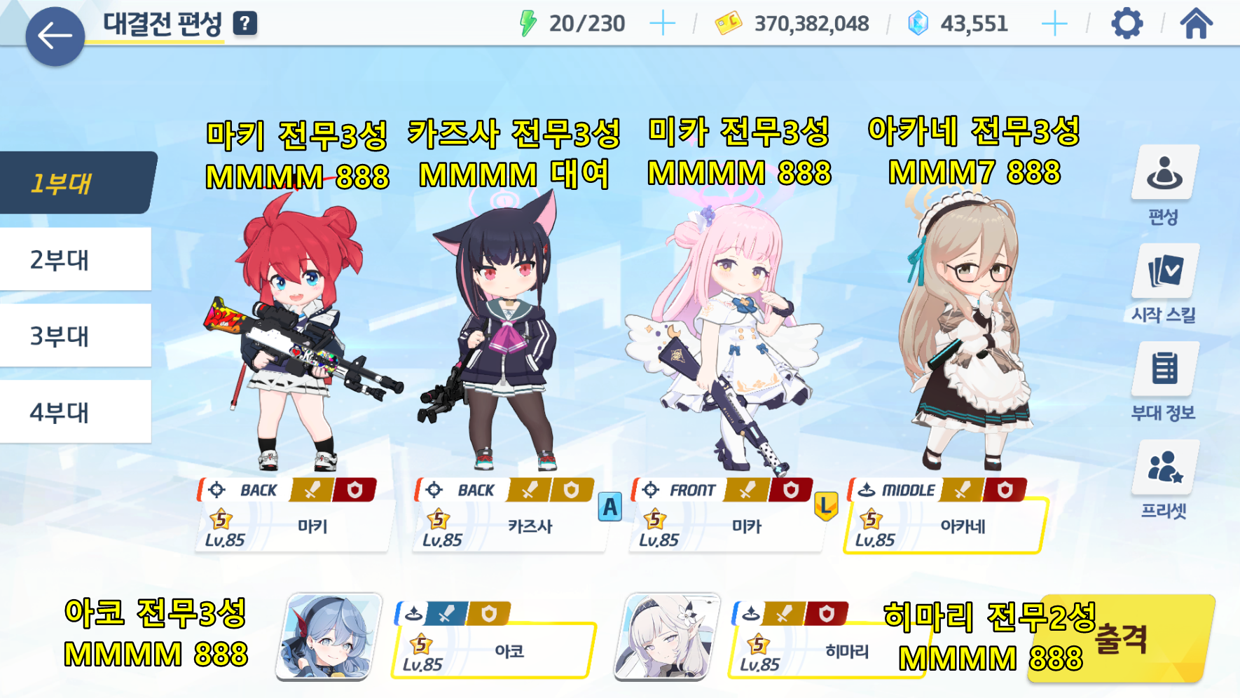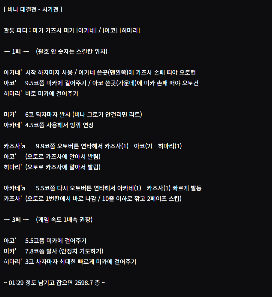 제가 클리어한 스펙입니다. (사진의 시작 스킬로 출격해주세요!) 적어도 미카와 카즈사만큼은 완벽하게 성장이 되어있어야 합니다. 제가 사용했던 택틱의 타임라인입니다. 저는 이렇게 하여 중장갑 비나 25,979,775점을 획득하였습니다.