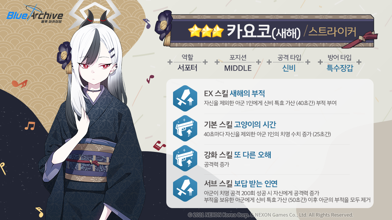 성능면에서는 카요코(새해)보다 낮긴하지만, 총력전의 최고 난이도인 [Torment]에서 채용을 하니, 여유가 되신다면 카요코(새해)와 함께 뽑아가시는 것을 추천드립니다!