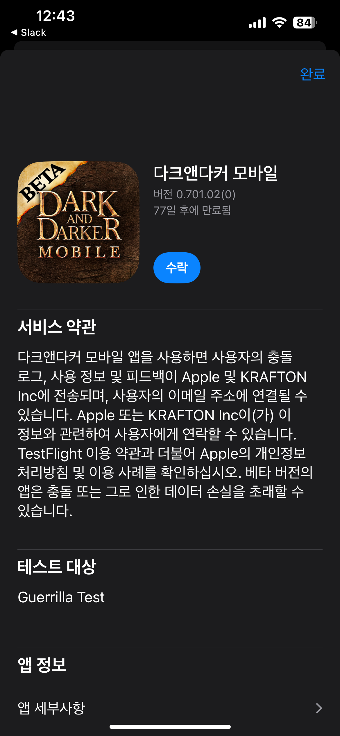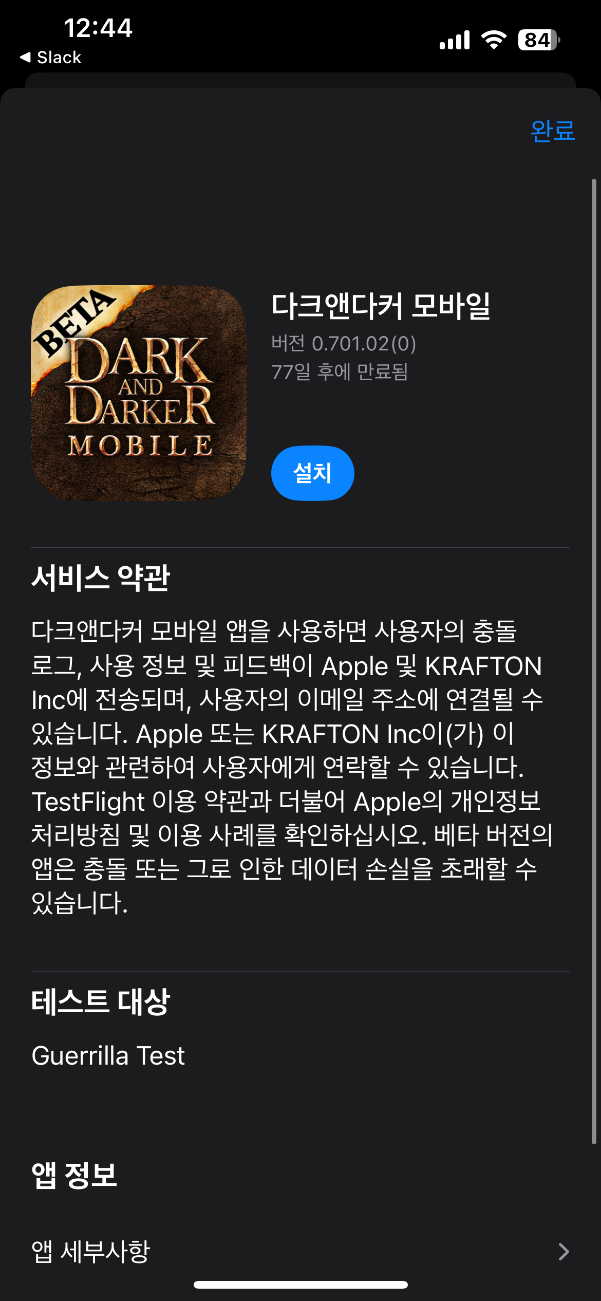 다크앤다커 모바일 게릴라 테스트 참여 신청 방법 사전 안내안녕하세요 모험가 여러분, 다크앤다커 모바일입니다. 먼저 다크앤다커 모바일을 응원해 주시고 기다려 주시는 모험가 여러분께 감사하다는 말씀을 드립니다. 지난 공지(보러가기)를 통해 안내해 드렸던 것과 같이 한국에 계신 모험가 여러분을 위한 게릴라 테스트가 진행될 예정이며, 이번 게릴라 테스트에서는 안드로이드 기기와 더불어 iOS 기기를 사용하시는 모험가 여러분께서도 참여하실 수 있습니다. 다만 iOS 기기에서 테스트에 참여할 수 있는 방법이 모험가 여러분께 다소 생소할 수 있어, iOS 기기에서의 게릴라 테스트 참여 방법도 별도로 함께 안내해 드리고자 합니다. 다시 한번 다크앤다커 모바일의 게릴라 테스트를 기다려 주시는 모든 모험가 여러분께 진심으로 감사드리며, 자세한 내용은 아래를 확인 부탁드리겠습니다. 게릴라 테스트의 상세 일정과 참여 링크 등의 내용을 담은 공지는 이후 별도로 안내해 드리도록 하겠습니다. 🔸 다크앤다커 모바일 게릴라 테스트 참여 신청 방법 사전 안내 📱 안드로이드 * 해당 공지를 안내 드리는 시점에서는 아직 사전 다운로드가 불가합니다. * 사전 다운로드가 가능한 시점에 추가로 별도 공지를 통해 안내해 드릴 예정입니다. 1) 구글 플레이 스토어 검색창에 '다크앤다커 모바일'을 검색하거나, 이후 별도 공지를 통해 안내될 링크를 통해 다운로드 페이지로 이동해주세요. 2) [설치] 버튼을 터치하여 사전 다운로드를 진행합니다. 🍎 iOS 1) iOS 테스트 참여에 필요한 Test Flight App을 설치합니다. 2) 게릴라 테스트 진행 예정 공지(이후 안내 예정) 내 오픈 링크를 클릭합니다. 3) 기기에 Test Flight App이 설치되어 있을 경우 '열기' 버튼이 활성화되며 해당 버튼을 터치합니다.
