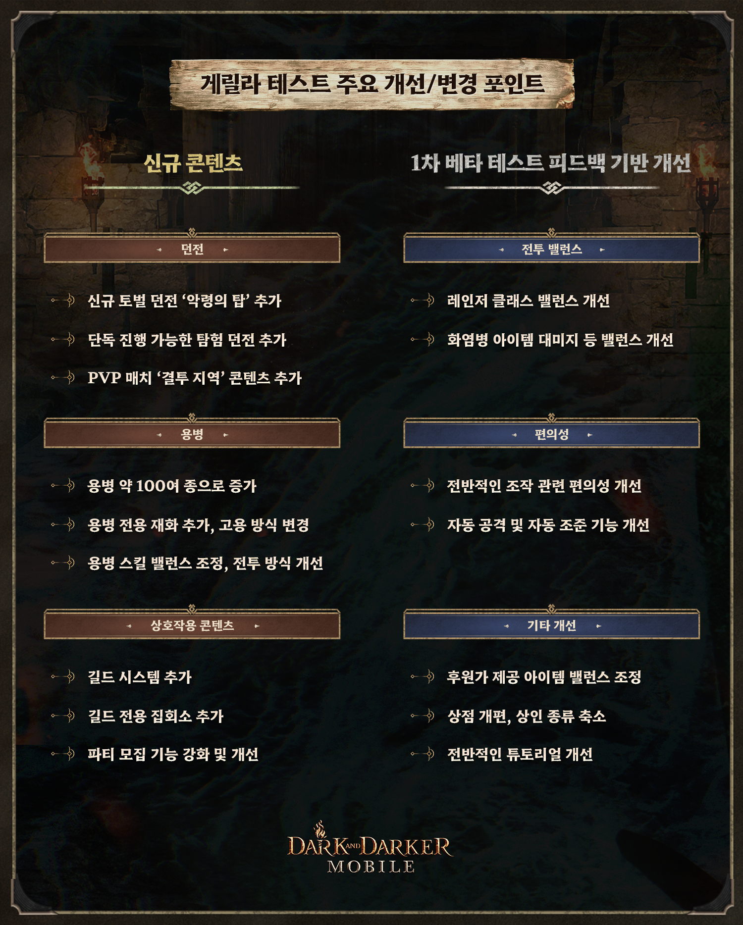 게릴라 테스트 주요 개선점 소개안녕하세요 모험가 여러분, CM | 횃불입니다. 앞서 '다크앤다커 모바일 게릴라 테스트 진행 예정 안내' 공지를 통해 안내 드린 것처럼, 저희는 게릴라 테스트로 모험가 여러분을 다시 만날 준비를 하고 있습니다. 짧지 않은 시간 동안 게릴라 테스트를 기다려 주셨던 모험가 여러분께 진심으로 감사드립니다. 지난 베타 테스트 이후 남겨 주셨던 소중한 의견들을 바탕으로 최선을 다해 막바지 작업을 진행 중에 있으며, 그 결과 이전보다 더 개선되고 변화한 모습으로 찾아뵐 예정입니다. 오늘은 다크앤다커 모바일에서 달라지는 여러 부분들 중 주요하게 개선되는 부분들에 대해 소개해 드리려 합니다. 이러한 개선점에 대해서는 곧 진행될 게릴라 테스트 기간 동안 체험하셔서 많은 의견을 남겨 주시기를 부탁드리며, 모험가 여러분의 많은 기대와 관심을 부탁드리겠습니다. 그럼, 기다릴 것 없이 지금 바로 소개해 드리겠습니다! 👉 게릴라 테스트 주요 콘텐츠 영상 미리보기 (1) 👉 게릴라 테스트 주요 콘텐츠 영상 미리보기 (2)