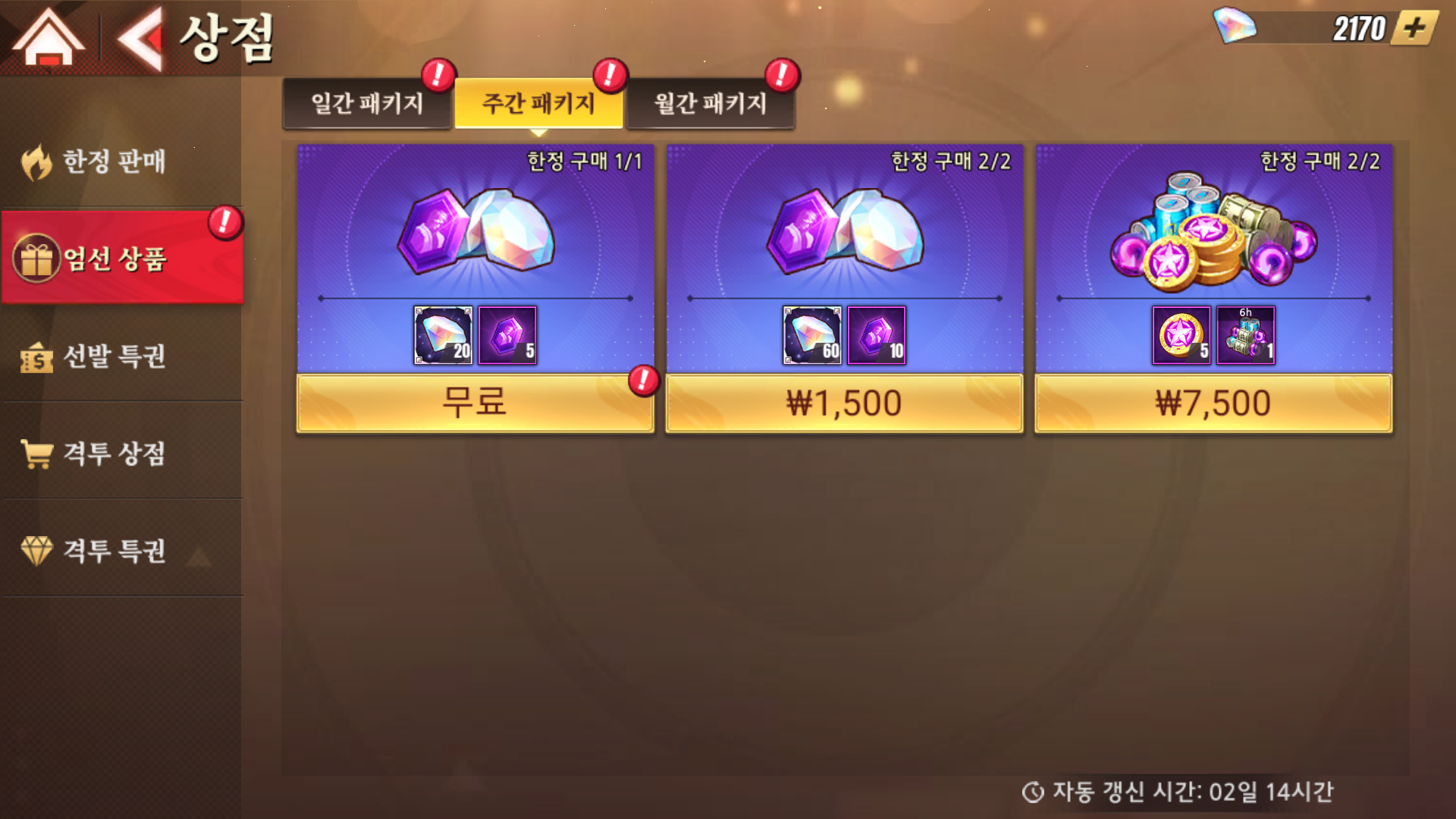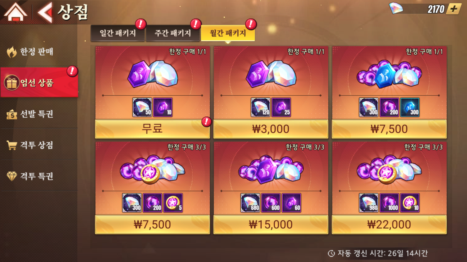 상점에서 매일 무료 보상 획득하자!상점에서는 일간, 주간, 월간 패키지에서 무료로 보상을 획득할 수 있으니 받아두시는 것을 추천합니다!