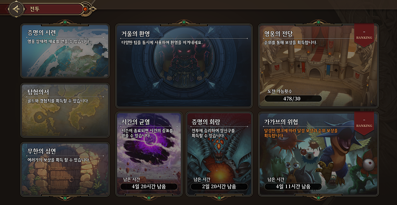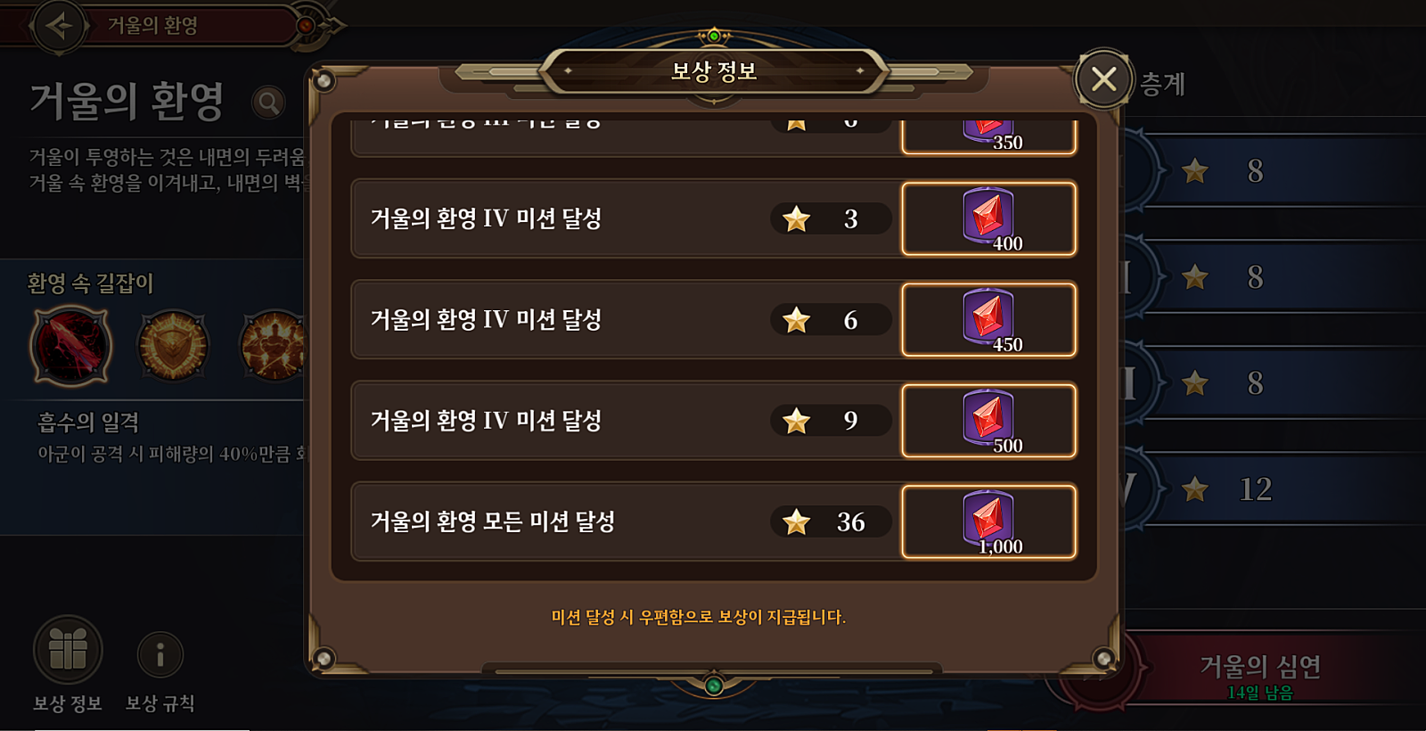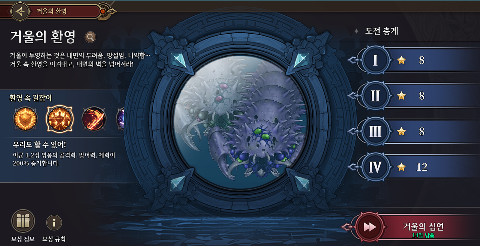 [디렉터노트] 이번 주 패치 주요 사항과 신규 콘텐츠 설명디렉터 노트 게릴라 쿠폰 쿠폰 번호 : LDXCZ 사용 기간 : 12월 20일 23:59:59까지 보상 : 영웅 소환권 5장 안녕하세요. 디렉터 이종주 입니다. 오늘은 이번 주 주요 패치 내용과 신규 콘텐츠 거울의 환영에 대해 설명드리고자 합니다. 그럼, 바로 시작하겠습니다. 새로운 시작 이벤트 2차 진행 지난주부터 진행 중인 새로운 시작 이벤트가 이번 주에 2차 업데이트를 맞이합니다. 새롭게 추가되는 콘텐츠는 아래와 같습니다. 챌린지 전투 챌린지 전투는 기본적으로 웨이브 전투이며, 총 3가지 다른 공략 방식으로 구성되어 있습니다. 챌린지 전투 1: 다수의 적 챌린지 공략 포인트: 다수의 적을 빠르게 제거할 수 있는 전략을 구성해야 합니다. 챌린지 전투 2: 생존 챌린지 공략 포인트: 공격은 큰 의미가 없으며, 생존을 위한 전략을 구성해야 합니다. 챌린지 전투 3: 데미지 챌린지 공략 포인트: 방어는 큰 의미가 없으며, 최대한 높은 데미지를 입히는 전략을 구성해야 합니다. 챌린지 전투 클리어 시 가넷과 이벤트 상점 재화인 ‘희망의 꽃’을 획득할 수 있습니다. 이번 2차 업데이트를 통해 희망의 꽃을 추가적으로 획득할 수 있게 되었으며, 이벤트 상점에 태초의 에테르가 주요 상품으로 추가되었습니다. 시나리오 카테드랄 재건과 관련된 시나리오가 추가됩니다. 이번 시나리오에서는 어빈이 가웨인의 부탁을 받고 카테드랄에 도착하는 모습이 보이네요. 또한, 아이멜, 슈나, 루키어스 등 반가운 영웅들의 모습도 같이 보이는 것 같습니다. 이번 주 시나리오를 통해 흥미로운 이야기를 즐기고 카테드랄 재건에 도움을 주시길 바랍니다. 신규 길드 레이드 이둔 이번 업데이트를 통해 이둔이 길드 레이드에 새롭게 추가되고, 다음 주기인 화요일부터 직접적으로 플레이를 할 수 있습니다. 이둔은 저번에 말씀드린 것처럼 마법 형 데미지를 낼 수 있는 영웅들이 유리하게 설계되어 있습니다. 제 기준으로 스코티아나 네프티스보다는 좀 수월하게 플레이했던 것 같습니다! 새로운 코스튬을 입은 영웅도 전투에 참여했네요. 과연 누구일지? 가가브의 위협 개선 관련 이전에 안내해 드렸던 가가브의 위협 개선 작업이 11월 28일로 확정되었습니다. 금일 안내해 드릴 내용은 시스템상 가가브의 위협이 월요일에 정산되기 때문에, 정산을 한 번 끊고 진행해야 하는 부분에 대한 안내입니다. 정산 일정 기존 스케줄: 11월 25일 ~ 12월 2일 변경된 스케줄: 11월 25일 ~ 11월 28일 00:00 (1회 정산) 11월 28일 ~ 12월 2일 (2회 정산) 정산이 2번 이루어지기 때문에 보상도 두 번 지급됩니다. 단, 보스는 카르니코스로 유지됩니다. 신규 콘텐츠 거울의 환영 설명 신규 콘텐츠의 규칙 설명을 사전에 제공하면 도움이 될 것 같아 준비했습니다. 이번 주 패치를 통해 거울의 환영 콘텐츠가 추가됩니다. 거울의 환영은 내면의 두려움, 망설임, 나약함 등이 거울에 투영되어 적으로 나타나는 콘텐츠입니다. 여러분은 거울 속 환영을 이겨내고 내면의 벽을 넘어서는 도전을 하게 됩니다. 다양한 팀을 구성해야 하는 콘텐츠지만 레벨이 70으로 보정 되기 때문에 계정 레벨 15부터 이용이 가능합니다. 콘텐츠는 거울의 환영과 거울의 심연으로 나뉘어져 있습니다. 콘텐츠 특징 - 거울의 환영 : 적응을 돕기 위한 일회성 콘텐츠로 구성됩니다. - 거울의 심연 : 2주 주기로 구성 및 변경됩니다. 거울의 심연 구성이 변경되는 항목 - 몬스터 변경 - 보상 초기화 - 환영 속 길잡이 변경 (특수 버프 제공) 특수한 규칙 - 환영 속 길잡이 선택 : 각 층에 입장하기 전 팀 구성에 맞는 버프를 선택하여 도전할 수 있습니다. 단 특수 버프는 한 팀에 1개씩만 사용 가능합니다. - 도구 사용 불가 : 거울의 환영에서는 도구를 사용할 수 없어 영웅 배치와 전략이 더욱 중요해집니다. - 영웅 중복 사용 제한 : 동일한 영웅을 다른 층에서 사용할 수 없기 때문에 다양한 영웅 활용이 요구됩니다. - 레벨 보정 시스템 : 모든 영웅은 레벨 70으로 보정됩니다. 보상 가장 궁금해하실 사항 중 하나일 것 같습니다. 보상의 컨셉은 주기마다 가넷을 지속적으로 획득할 수 있는 콘텐츠로 잡았습니다. 거울의 환영은 일회성 보상이지만, 심연은 2주마다 보상을 획득할 수 있게 설계되어 있습니다. 각각 층에 클리어 수준(미션 달성 수준)에 따라 ★을 획득하고 ★의 개수마다 보상을 획득할 수 있습니다. 층마다 최고로 달성할 수 있는 ★의 개수는 12개이지만, ★9개만 획득하여도 전체 보상을 획득 할 수 있도록 설계 되어있습니다. 거울의 심연의 등장하는 적들은 기존의 패턴과 조금씩 다르기 때문에 공략법을 찾아야 합니다. 적의 상황과 나의 팀 상황에 맞는 환영 속 길잡이를 선택하고. 다양한 영웅을 활용하여 심연을 공략해 보시길 바랍니다. <개발 중인 이미지로 실제 패치 때는 달라질 수 있습니다> 오늘 전달 드릴 내용은 여기까지입니다. 대부분 노트에서 이미지보다는 텍스트 위주로 작성하였는데, 이번에 신규 콘텐츠를 설명하는 만큼 이미지를 많이 사용하면서, 앞으로도 가능하면 이미지를 최대한 많이 첨부해 드려야겠다는 생각이 들었습니다. 사실 