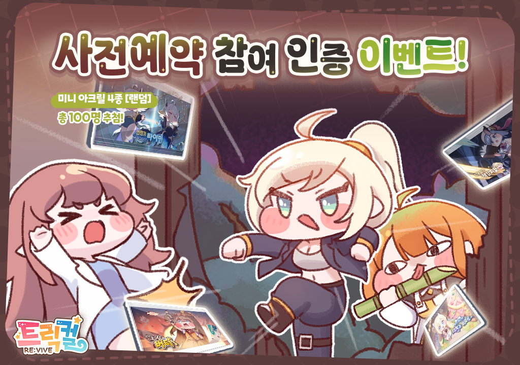트릭컬 리바이브 2.5주년 사전예약 이벤트 안녕하세요, 교주님들! 귀염뽀짝! 볼따구 라이프! 트릭컬 리바이브입니다. 트릭컬 리바이브 2.5주년 기념 사전예약 홈페이지가 오픈되었습니다! 사전예약에 참여하시면 한정 보상이 담긴 특별한 쿠폰을 받아보실 수 있습니다. 또한, 사전예약 페이지에서는 2.5주년 기념 이벤트와 다양한 커뮤니티 이벤트 소식도 확인하실 수 있으니 교주님들의 많은 관심과 참여 부탁드립니다! 📅 사전예약 가능 기간 - 03/13(금) 공지 이후 ~ 04/23(목) 10:59 ※ 사전예약 페이지가 정상적으로 노출되지 않는 교주님들께서는 아래 방법을 진행해 주시기 바랍니다. 1) 브라우저 쿠키/ 캐시 삭제 진행 2) Ctrl + F5을 통한 캐시 클리어 진행 🎁 사전예약 쿠폰 보상 - [전설 펫] 쁘띠 리뉴아 - 엘리프 2,500개 ⏳ 사전예약 쿠폰 사용 기한 - 사전예약 > 쿠폰 코드 수령 후 4월 23일 10:59까지 🚩 주의사항 - 사전예약 참여 후에 쿠폰이 지급됩니다. - 지급된 쿠폰은 이벤트 기간 동안만 사용 및 보상 수령이 가능합니다. - 이벤트 종료 후 사용하지 못한 쿠폰에 대해서는 별도 도움을 드리기가 어렵습니다. - 발급된 사전예약 쿠폰은 "개인용" 쿠폰입니다. - 발급된 사전예약 쿠폰은 계정당 1회만 사용 가능합니다. - 쿠폰 코드를 타인과 공유하여 본인이 아닌 계정에 사용 시 복구는 불가합니다. - 타인 계정에 쿠폰 코드를 입력했을 경우 지급된 아이템의 회수 후 재지급은 불가합니다. - 쿠폰 코드를 복사하지 않고 창을 종료했을 경우 재인증하면 쿠폰 코드가 노출됩니다. - 쿠폰 코드가 정상적으로 노출되지 않을 경우 웹페이지 내 자동 번역 사용 여부를 체크해 주시길 바랍니다. 감사합니다. 안녕하세요, 교주님들! 귀염뽀짝! 볼따구 라이프! 트릭컬 리바이브입니다. 3월 13일(금)부터 2.5주년 기념 여왕님의 초대가 시작됩니다! 또한 3월 26일부터 2.5주년을 기념해 총 600연차를 획득할 수 있는 다양한 이벤트가 진행될 예정입니다. 교주님들을 위한 특별한 선물들이 준비되어 있으니 많은 관심과 참여 부탁드려요! 이벤트의 자세한 내용은 지금 바로 확인해 보세요. ◈ 2.5주년 여왕님의 초대 사전등록 인증 이벤트 ◈ 1. 이벤트 기간 - 3월 13일(금) 공지 이후 ~ 4월 23일 10:59 2. 이벤트 참여 방법 1) 2.5주년 사전예약 페이지에 접속한다 2) 여왕님의 초대장을 작성한다. 3) 사전예약 완료 후 쿠폰을 사용하고 우편함을 캡쳐해 인증한다! 3. 당첨 경품 - 미니 아크릴 블록(랜덤) 총 100명 추첨 ✔ 이벤트 유의사항 - 계정당 1회만 참여하실 수 있습니다. - 미풍양속을 해치는 닉네임의 경우 당첨자에서 제외될 수 있습니다. - 최초 작성 게시글 외 중복으로 참여된 게시글은 별도의 통보 없이 삭제될 수 있습니다. - 이벤트와 무관한 내용 및 커뮤니티 이용정책을 위반하는 내용이 포함된 경우 별도의 권고 및 통보 없이 삭제될 수 있습니다. - 타인의 스크린샷을 도용하였을 경우 참여가 인정되지 않습니다. - 팔로우 후 이벤트 게시판에 게시글을 업로드하지 않으신 경우 추첨에서 제외될 수 있습니다. ![]() ![]()