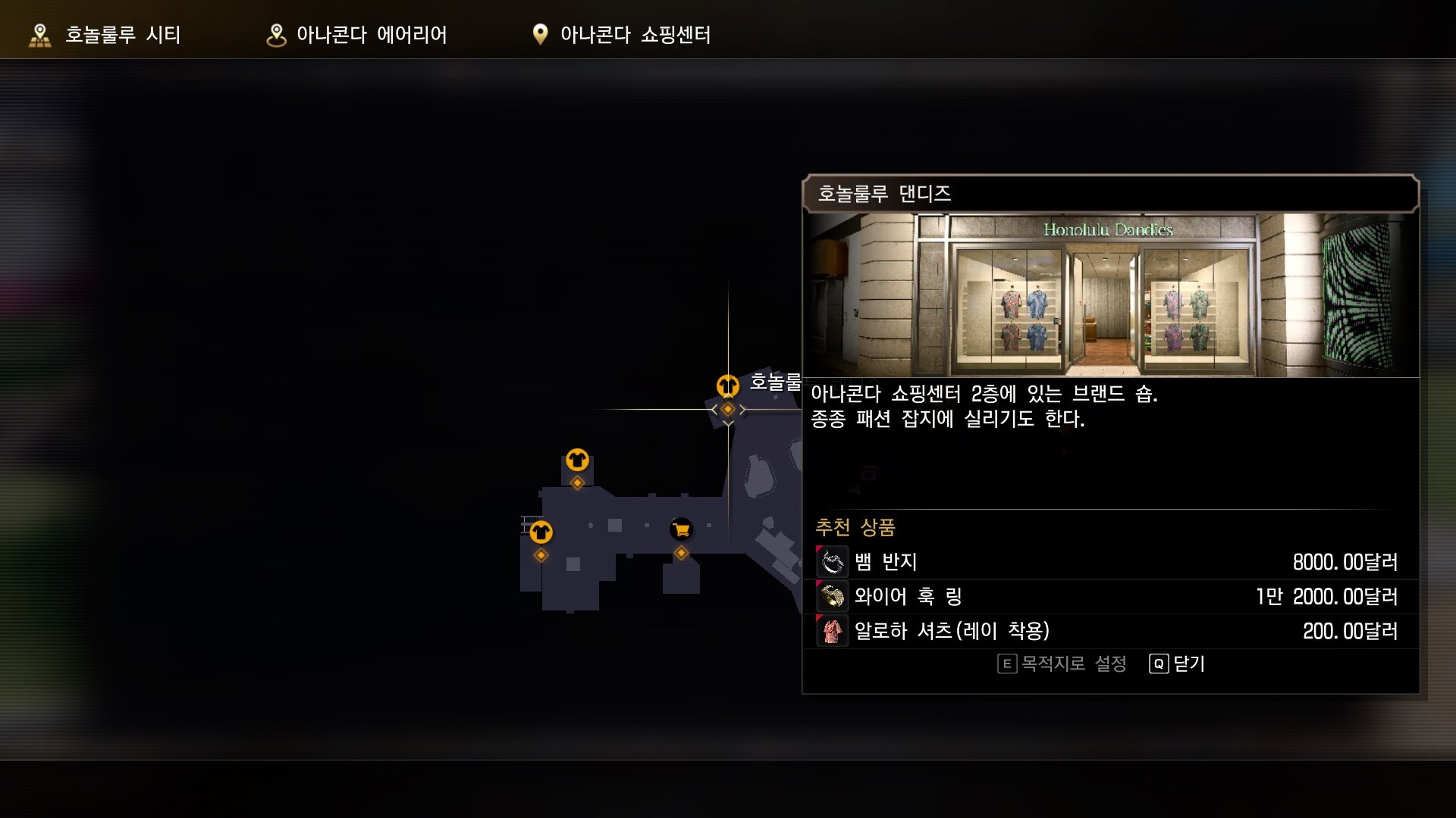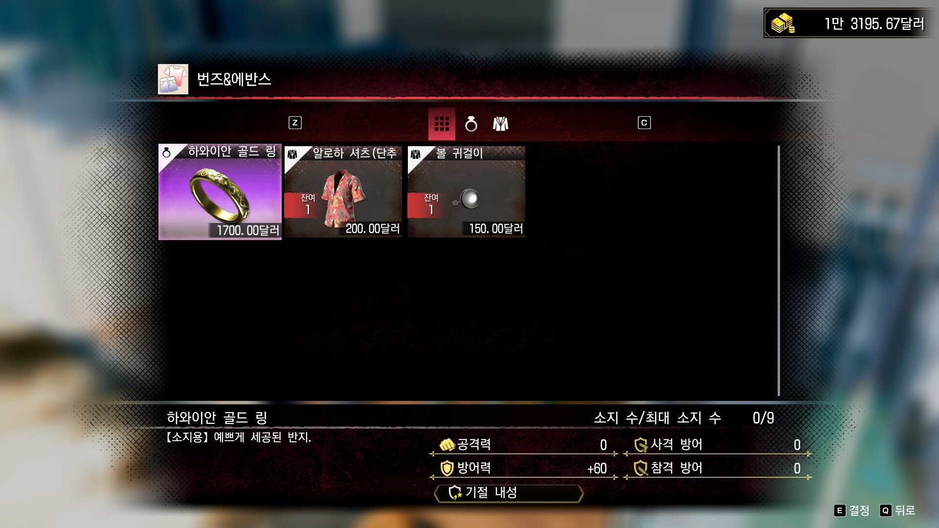 반지 판매 상점 정리 - 용과 같이8 외전용과 같이8 외전에서는 장비의 역할을 반지가 대신합니다. 반지를 착용해 능력치를 얻고 종류에 따라 추가 효과를 받기도 하는데요. 반지는 보물상자에서 나오기도 하지만, 상점에서 달러로 구매도 가능합니다. 대부분 호놀룰루 시티에서 판매 중이며 이 중 일종의 세트 효과를 지닌 것도 있으니 잘 살펴보고 구매하는 것을 추천합니다. 참고로, 동일 반지 중복 착용도 가능한 것 같아요. ※ 놓친 상점이 있다면 제보 부탁드립니다 ■ 호놀룰루 시티 와이키키 타운 동쪽 에어리어 알로하 스트리트 [번즈&에반스] - 하와이안 골드 링 1700달러 - 하와이안 골드 링 : 소지용, 방어력 60, 기절 내성 ![]() ![]() 와이키키 타운 동쪽 에어리어 알로하 스트리트 [퍼플 돌핀즈] - 앵커 링 4,500 달러, 하와이안 실버 링 1,400 달러 - 앵커 링 : 엄지용, 방어력 180, 참격 방어 80, 나침반/항해의 반지 함께 착용 시 파이리츠 히트 상승률 증가 - 하와이안 실버 링 : 소지용, 방어력 180 ![]() ![]() 와이키키 타운 서쪽 에어리어 시사이드 애비뉴 [노 서프 노 라이프] - 앵커 링 4,500 달러, 항해의 반지 5,300 달러 - 앵커 링 : 엄지용, 방어력 180, 참격 방어 80, 나침반/항해의 반지 함께 착용 시 파이리츠 히트 상승률 증가 - 항해의 반지 : 사격 방어 20, 방어력 80, 참격 방어 20, 나침반 반지/앵커 링과 함께 착용 시 파이리츠 히트 상승률 증가 ![]() ![]() 와이키키 타운 서쪽 에어리어 월드 와이드 마켓 빌리지 [화이트 쇼어 부티크] - 하와이안 골드 링 1,700 달러, 하와이안 실버 링 1,400 달러 - 하와이안 골드 링 : 소지용, 방어력 60 - 하와이안 실버 링 : 방어력 180 ![]() ![]() 와이키키 타운 남쪽 에어리어 크리스털 알로하 리조트 [Julia`s Brilliant Design] - 하와이안 골드 링 1,700 달러, 벚꽃 반지 4,000 달러, 차지 건 링 9,800 달러, 하와이안 실버 링 1,400 달러 - 하와이안 골드 링 : 소지용, 방어력 60, 기절 내성 - 벚꽃 반지 : 소지용, 방어력 60, 한냐/뱀 반지 함께 착용 시 광견 공격 속도 상승 - 차지건 링 : 엄지용, 공격력 70, 방어력 150, 차지 건 차지 시간 단축 - 하와이안 실버 링 : 방어력 180 ![]() ![]() 아나콘다 에어리어 아나콘다 쇼핑센터 [리프 라이더즈] - 앵커 링 4,500 달러, 항해의 반지 5,300 달러 - 앵커 링 : 엄지용, 방어력 180, 참격 방어 80, 나침반/항해의 반지 함께 착용 시 파이리츠 히트 상승률 증가 - 항해의 반지 : 사격 방어 20, 방어력 80, 참격 방어 20, 나침반 반지/앵커 링과 함께 착용 시 파이리츠 히트 상승률 증가 ![]() ![]() 아나콘다 에어리어 아나콘다 쇼핑센터 [아나콘다 스포츠점] - 더블 실버 링 800 달러, 체인 링 800 달러 - 더블 실버 링 : 사격 방어 60, 방어력 80 - 체인 링 : 방어력 80, 참격 방어 60 ![]() ![]() 아나콘다 에어리어 아나콘다 쇼핑센터 [호놀룰루 댄디즈] - 뱀 반지 8,000 달러, 와이어 훅 링 12,000 달러 - 뱀 반지 : 공격력 160, 사격 방어 30, 방어력 40, 참격 방어 60, 한냐/벚꽃 반지 함께 착용 시 광견 공격 속도 상승 - 와이어 훅 링 : 엄지용, 공격력 150, 방어력 150, 다운된 적에게 와이어 훅으로 추가타 가능 ![]() ![]() 아트&나이트 에어리어 펄 애비뉴 [사격용품 불릿 헬] - 차지 건 링 9,800 달러 - 차지건 링 : 엄지용, 공격력 70, 방어력 150, 차지 건 차지 시간 단축 ![]() ![]() 아트&나이트 에어리어 트와일라이트 드라이브 [두근두근 하이퍼 엑스터시] - M 링 5,800 달러, S링 2,900 달러 - M 링 : 방어력 120, 감전 내성, 대미지를 받을 때 히트 게이지 상승 - S 링 : 공격력 150, 방어력 80, 착용 시 호전적으로 변화 ![]() ![]() 아트&나이트 에어리어 트와일라이트 드라이브 [구제 옷 가게 나이트 마처즈] - 현무의 반지 : 공격력 100, 방어력 130, 사신수 반지 모두 착용 시 상태 이상에 강화 - 더블 실버 링 : 사격 방어 60, 방어력 80 - 체인 링 : 방어력 80, 참격 방어 60 ![]() ![]() 리틀 재팬 에어리어 후지 스트리트 [간류지마 상점] - 주작의 반지 8,500 달러 1개 구매 가능, 벚꽃 반지 4,000 달러 - 주작의 반지 : 엄지용, 공격력 100, 방어력 200, 사신수 반지 모두 착용 시 상태 이상에 강화 - 벚꽃 반지 : 소지용, 방어력 60, 한냐/뱀 반지 함께 착용 시 광견 공격 속도 상승 ![]() ![]() 차이나타운 에어리어 랜턴 스트리트 [중화 무구 무술관] - 뱀 반지 8,000 달러, 백호의 반지 3,500 달러, 청룡의 반지 3,500 달러, 커틀러스 링 9,800 달러 - 뱀 반지 : 공격력 160, 사격 방어 30, 방어력 40, 참격 방어 60, 한냐/벚꽃 반지 함께 착용 시 광견 공격 속도 상승 - 백호의 반지 : 사격 방어 50, 방어력 170, 사신수 반지 모두 착용 시 상태 이상에 강화 - 청룡의 반지 : 공격력 50, 방어력 120, 참격 방어 50, 방어력 120, 사신수 반지 모두 착용 시 상태 이상에 강화 - 커틀러스 링 : 엄지용, 공격력 70, 방어력 150, 커틀러스 부메랑 궤도 변경 ![]() ![]() ■ 매드란티스 주점 에어리어 [BLACK BOAT] - 체인 링, 더블 실버링 1개 구매 가능, 개당 800 달러 - 더블 실버 링 : 사격 방어 60, 방어력 80 - 체인 링 : 방어력 80, 참격 방어 60 ![]() ![]()