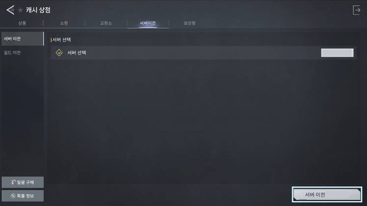 2) [상점] > [서버 이전] > [서버 이전] 메뉴에 진입합니다.