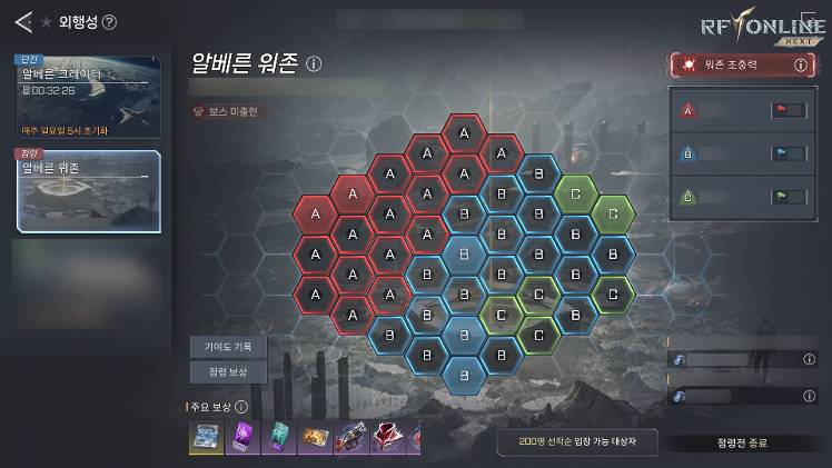 🔸알베른 워존 소개 알베른 워존은 [외행성] > [알베른 워존] 메뉴를 통해 진입하실 수 있으며, 같은 월드 그룹 내 3개의 서버가 매칭되어 진행 시간동안 최대한 많은 구역을 점령하여 가장 많은 포인트를 획득한 서버가 승리하는 콘텐츠입니다. 알베른 워존은 하나의 서버에서 최대 300명이 입장 가능하며, 최대 900명까지 입장 가능합니다.
