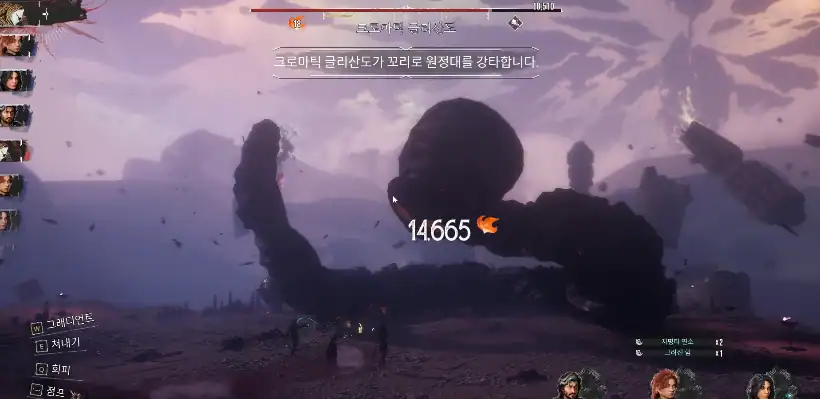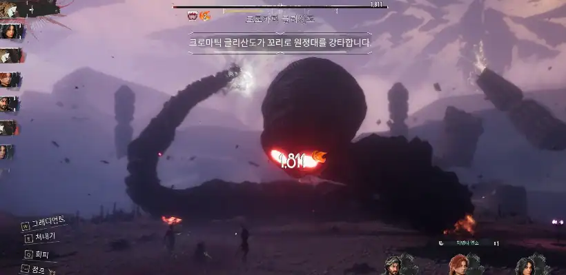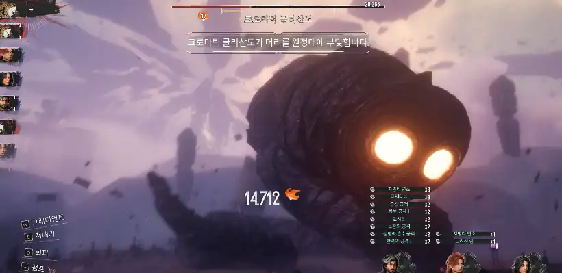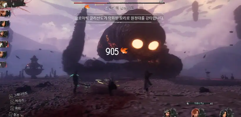 보스 「크로마틱 글리산도」 패턴 공략 (꼬리 파괴가 최우선)클레르 옵스퀴르:33 원정대에서 루네의 관계 레벨을 5→6으로 올릴 때 만날 수 있는 보스입니다. 서브 보스치고는 패턴이 꽤 짜증납니다. 꼬리를 파괴하여 큰 데미지를 줄 수 있어 사격으로 꼬리를 파괴하는 게 우선이며 (꼬리는 시간이 지나면 재생됨) 캐릭터가 사망하면 그걸 먹어서 부활을 못하게 하고 체력 6만 정도를 회복하니 체력 관리도 중요합니다. 특히 타수가 많아서 기절 걸고 두들겨패는 경우가 많습니다. 또한 체력이 10~20% 가량으로 떨어지면 분노 상태가 됩니다. 약점은 어둠입니다. 1. 머리 부딪히기 (1타 / 2타)