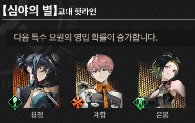 # 해당 교대 핫라인에서는 6★ 용정, 5★ 계항, 5★ 은봉의 영입 확률이 증가합니다.