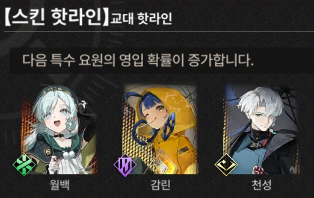 # 해당 스킨 핫라인에서는 6★ 월백, 5★ 감린, 5★ 천성의 영입 확률이 증가합니다.