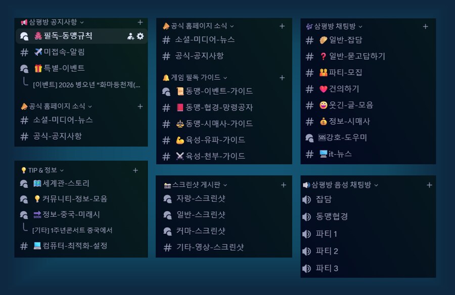 (저희 디스코드 채널 목록입니다.) 저희 동맹은 동맹 협경 및 동맹 활동을 꾸준하게 해주시는 멤버들이 매우 많습니다. 그래서 더 원활한 소통과 활동을 장려하기 위해 디스코드를 운영 중입니다. 동맹 규칙 확인은 필수!! 입니다. 또한, 게임 내 각종 팁 공유 및 신규 협경(레이드) 시 디스코드를 통해서 음성 채팅으로 진행합니다. (디스코드 음성 채팅은 절대 강제는 아니지만 협경 같은 이벤트 진행 시에는 가급적 참여를 권장드리고 있습니다.) 또한, 각종 각종 커뮤니티에 등록된 여러 유용한 팁을 정리하여 쉽게 보실 수 있도록 준비해놨고, 사주님과 제가 시간나는대로 저희가 알고 있는 팁을 정리하여 가이드 형식으로 배포하고 있습니다.