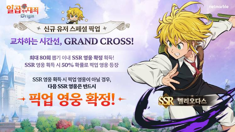 ✦ 신규 유저 스페셜 픽업 - ‘멜리오다스’ 스페셜 픽업 이벤트는 <일곱 개의 대죄: Origin>에 처음 접속하시는 모든 별지기님을 대상으로 픽업 기간과 관계없이 최초 접속일 기준으로 3주간 오픈됩니다. - 최대 80회 뽑기 이내에 SSR 영웅이 최소 1번 등장하며 SSR 영웅 획득 시 50% 확률로 픽업 영웅이 등장하고, 픽업 영웅이 등장하지 않을 경우 다음 SSR 영웅 획득 시 픽업 영웅이 확정으로 등장합니다. - 뽑기 진행도나 결과와 무관하게 120회 뽑기에서는 픽업 영웅을 확정으로 획득할 수 있습니다.