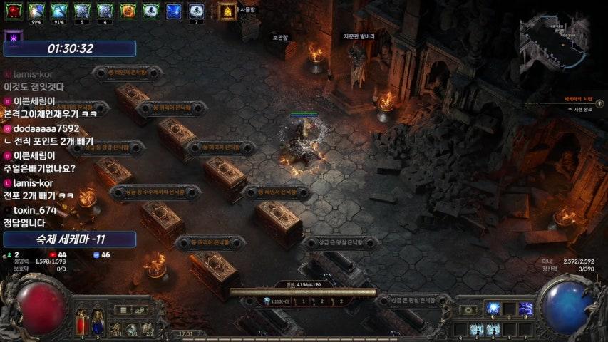 [3.10] 맨주먹 지옥불 강타 치프틴안녕하세요. 가슴이 시켜서 하는 불주먹 - 맨주먹 지옥불 강타 치프틴 빌드 소개 드립니다. 1. 빌드 메커니즘 맨주먹 소형 스킬 군 주얼로 얻게 되는 공허의 손아귀 기술 핵심 노드 중에서 > 홀가분 상태에서 민첩 10당 공격 물리 베이스 데미지 증가 효과가 있습니다. ![]() 이 효과를 극대화 하기 위해 아래 이중 인격 주얼을 여러개 사용해서 민첩(+@, 주로 힘 or 최대 생명력 등)최대한 확보합니다. ![]() 이중 인격 주얼의 민첩 증가 효과를 극대화 하기위해서 아래와 같이 패시브 노드를 최대한 뱅뱅 돌려서 길게 만듭니다. ![]() 그리고 다수의 이중 인격 주얼을 사용하여 베이스 민첩을 최대한 당깁니다. 저는 참고로 100렙 기준, 민첩+5, 힘+5 이중 인격 주얼 X 7개를 사용하여 민첩과 힘을 최대한 당기고 민첩과 능력치 #%가 붙은 장비와 패시브를 통해 민첩을 1,813 까지 만들었습니다. ![]() 이렇게 쌓아올린 민첩은 1. 캐릭터의 물리 데미지를 뻥튀기 2. 뻥튀기 된 물리 데미지를 > 100% 화염 데미지로 전환 (지옥불 강타 스킬 자체 50% + 치프틴 전직 노드 불꽃의 진보, 나마후 50%) 3. 1초에 핵 불주먹을 3방씩 꽃아넣는 상남자 빌드가 완성됩니다. 2. 템 세팅 홀가분 상태를 유지 해야 하므로 무기 2자리 장갑 자리는 비워야 합니다. ![]() - 이 자리를 비워 두지 않고 능력치 요구사항이 높은 무기나 장갑(주로 묠니르, 참회 십자군 장갑)을 억지로 장착 하고 능력치를 지워서 빨간불이 들어오게 한 후 젬 농사 짓는 분들이 많습니다. - 이는 선택 사항 2-1 투구 ![]() 지옥불 강타 물리 피해의 15%를 추가 화염 피해로 획득 인챈트의 효율이 압도적으로 좋습니다. 스타콘자 대신 드보토 or 주변 적 화염 저항 -9% 달린 전쟁군주 베이스 투구도 가능합니다만, 스타콘자 가성비가 너무 좋아서... 2-2 갑옷 ![]() 민첩 12% 증가가 붙은 엘더 or 대속자 우주의 판금 갑옷을 사용 합니다. 냉기 저항과 번개 저항을 각각 40% 이상 확보해야 저항 값이 맞춰 집니다. 그리고 저는 접두가 비어 있는 템이라 생명력을 달았지만, 접미가 한자리 비어있다면 크래프팅으로 능력치 6%증가를 붙여주면 더 좋습니다. 대안으로 황야의 겉옷이 있습니다.(민첩 15%증가, 민첩 15당 피해 1%증가 유니크) 다만 오프 컬러 6개(빨5+파1)의 압박이 있으므로 잘 선택하시길... 만약 황야의 겉옷을 기용한다면 투구에서 냉기+번개 저항 40%을 당겨와야 합니다. 2-3 신발 ![]() 최적의 아이템입니다. 민첩이 1,800이 넘어가므로 최대 생명력 360 증가 효과 2-4 목걸이 ![]() 능력치 뻥튀기 목걸이 2-5 반지 ![]() 비통의 고리 X2 입니다. 비쌉니다. 2-6 허리 ![]() 능력치 뻥튀기 허리 입니다. 2-7 플라스크 1. 생명력 (출혈 면역) 2. 수은 (저주 면역) 3. 사자의 포효 4. 지혜의 참나무 5. 앗지리 or 병밑 등 취향것 3. 스킬 예시 6링크 (메인 스킬 - 갑옷) - 지옥불 강타 - 방어 상승 보조 - 근접 물리 피해 보조 (+ 각성) - 공격 시 원소 피해 보조 (+ 각성) - 원소 집중 보조 (+ 각성) - 매핑 (선대의 부름 보조) - 보스 (연속 타격 보조) 4링크(버프) - 재의 전령 - 육체와 돌 - 분노 - 계몽 보조 4소켓(유틸 및 저주) - 화염 질주 - 바알 용암 방패 - 인화성 - 피의 격노 TIP: 유일한 방어기제가 사자의 포효 + 용암 방패 or 바알 용암 방패입니다. 방어력이 높아 효율이 아주 좋으므로 수시로 활용할수록 생존력이 올라갑니다. 4. 플레이 영상 5. 마치며 세팅과 아이템을 보시면 알겠지만 가성비 좋은 빌드 절대 아닙니다. 거기다가 치프틴이라는 캐릭 특성상 한계점이 명확하고, 근접 빌드라 난이도가 높습니다. 쉽고 강한거 하시려면 5전령이나 대마법사 폭낙 등 대안이 엄청 많습니다. 하지만, 이 모든 단점에도 불구하고 손맛 하나는 정말 끝내주는 빌드 입니다. 저는 이번 시즌 치프틴으로 스타트해서 화염 칼날 소용돌이로 100렙 찍고 난뒤에 이 빌드로 갈아타고 너무 재밌고 신나게 플레이 했습니다. 하다보니 40챌 까지 했네요. 이제 남은 시즌은 설렁설렁 즐기면서 치프틴으로 다른 화염 빌드나 가지고 놀려고 합니다. 긴 글 읽어 주셔서 감사합니다.