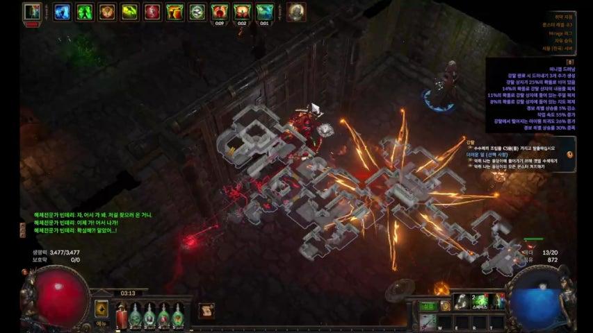 3.18 저렴한 cwdt(2엑~3엑) 안녕하세요. 겜린이 입니다. (유튜브(겜린이),트위치 (겜린이_1,gamelin_e)) 누더기 버전 cwdt 소개 받아서 해보았는데 괜찮아서 소개 드릴려고 합니다. 겜린이 POB https://pastebin.com/DY4gaGSk 참고 동영상 : https://www.youtube.com/watch?v=aGGL2gDj1Q4 원본 링크 : 흙수저식 cwcwdt 아이템 조립 가이드 (*군주 키스톤 추가) - 패스 오브 엑자일 마이너 갤러리 (dcinside.com) ![]() 6.목걸이 : 조프의 피 호박목걸이 제작 : 조프의 심장 + 조프의 축복 성유 : 전투분발 (적갈빛,신록빛,담청빛) : 생존 기재. 7.반지 : 마음에 묶인 고리 월장석 반지.2개 (퀄리티 작업 안 되어있는것.) 8.허리띠 : 전술가 징 박힌 허리띠 유목민, 거물 도 있지만 젤 좋은건 전술가. 9.플라스크 : 올로스의 결의 철 플라스크 충전 소모량 44% 이하가 좋고 최대 47 까지라고 함. 플라스크 퀄리티 20(유리직공의 방울 사용) 10주얼 1.직관의 도약 2.몰려오는 불꽃 3.생존 본능. 4.잔인한속박 무궁한 주얼 발바라의 아카라에 속한.역사적인 순간. - 이거 착용 하면 불가지론자 - 배반자로 바뀜. 물약 재사용 시간 증가!! 노드 찍을때 중요. 1.지팡이 숙련 – 지팡이 장착 시 방어력 30%증가 2.배반자 노드 찍어야함.(불가지론자 ,잔인한 속박 무궁한 주얼 ) 3.장화 드루이드 의식 성유 작업. 4.생존본능 주얼 – 플라스크 지속 시간. 판테온 물리 피해 감소 옵션 사용 하면 자해 데미지가 줄어들어서 cwdt가 안터질 수 있음. 추천 염수왕,유굴 (고통의 이교도 수확 작업) 군주의 가죽 가능 옵션. 소환수 불안정,도관,변함없는 자세,고통의 조율,강철 손아귀,근접 사격,춤추는 화살,곡예,물질보다정신, 불의 화신,진홍색 춤,룬 결속사,비껴내기,소집,자만의 정점,꿰둟는 자,멸망의 날 추천 강철의 의지. 비껴내기. 가격이 너무 비쌈. 젬 구매 팁. 젬 레벨업 되어있음. 1장 정화의 불길, 비전쇄도 보조, 연소 보조, 해골 소환 x2, 정의의 화염 (바알 몇개 바르다보면 바알 정의의 화염가능한걸로 앎), 시체 불덩이, 화염구, 치명타 증가 보조, 서리 점멸 2장 신념의 파도, 모독, 치명타 피해 증가 보조 3장 원소의 순수함 4장 피격 시 시전 보조 x4, 집중 유지 중 시전 보조 릴리 암살자의 징표, 영원한 축복 보조, 회오리 바람, 화염 관통 보조or영감 보조 주의 사항 불가능 지도 옵션 회복 : 재생이 기본인 빌드라서 안됨. 플라스크 : 플라스크 재사용 시간이 줄어들어서 안됨. 취약성 : 수호 넘어 버려서 죽음. 빌드 매커니즘. 피격시시전보조 : cwdt(Cast when damage Taken ) 집중유지중시전보조 : cwc(Cast While Channeling) 회오리 바람 시전 - 해골 소환 4마리 0.3초마다 소환. -재소환 되면서 기존 해골 죽음. -죽으면서 반지 때문에 370 *2 의 물리 데미지를 본인 한테 줌. - 머리에 피격시 시전이 발동 하면서 해골 3마리 추가로 소환 -회오리로 소환한 해골 터지면서 머리에서 소환한 해골 3마리도 같이 데미지 받고 죽음. 무한 반복. 이때 들어오는 자해 데미지로 각 부위에 연결된 cwdt 가 동작 이때 살아 있는 이유는 수호로 가드 함. 물약 옵션에서 수호 깨지지 않음. 무한 데미지 받는게 가능. 중요한 건 플라스크 재사용. 운용 팁. 처음 맵에 진입 하면 물약이 가득 찬 상태가 되었을때 물약 강제로 한번 사용. 맵 바뀔때 마다 한번은 눌러줘야함.(이때 물약이 가득 찰때까지 기다려야함.)