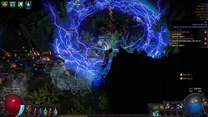 폭발성 사격으로 감전을 걸고 감파탄으로 보스를 잡을 때 감전이 오래 가지 않아서 문제였죠. 펍건의 솔루션도 있지만 전 좀 다르게 해봤습니다. 일단 호와를 써서 번개 딜을 챙긴 것을 냉기 컨버트 형제의 부름을 써서 냉기:번개 78대22 비율로 바꿨습니다. 몽크 노드에서 번개 게인도 챙기고 상태이상 노드도 많이 챙기고 해서 폭발성 사격만으로 점화, 동결, 감전을 걸 수 있도록 만들었습니다. 삼룡이를 쓰면 쉽다지만 전 ci라 투구에서 400 챙길 수 있는 에쉴이 너무 크고 노드에서 투구 에쉴당 +2회피를 찍으면 회피가 0%에서 34%로 오르기 때문에 버릴 수가 없겠더군요. 폭발성 사격에 '태풍불길'을 연결해서 몹에 점화가 걸려 있는 이상, 감전이 사라지지 않도록 합니다. 또, 감전 강도 75% 젬도 쓰면 감전 강도 노드를 안 찍어도 감전으로 35%까지 딜 증폭이 됩니다. 감전 100%, 번개 딜 25%, 난사 정도까지 6링크 하면 82렙 균열 보스 제쉬트도 한 방에 감전이 걸립니다. 화염벽-요새-연속주문-지속성 정도 연결해서 염벽을 쓰면 보스방에 충분한 범위로 깔려서 보스에게 점화를 계속 걸어줘서 감전이 지속됩니다. (5링크면 효과 범위 40% 추가나 시전 속도 증가 25%) 그럼 이제 감파탄을 쓰면 되는 거죠. 간간히 염벽을 리필 해주고요. 혹시 감전이 꺼지면 다시 폭사로 걸면 되고요. 1, 2 단계 제쉬트 정도는 염벽 한 번 리필해주면 10-20초 사이에 패턴 안 보고 잡더군요. 3단계는 패턴 한 번쯤 보고 잡고요. 번개 딜이 좀 부족해서 스왑으로 번개 게인이 있는 법봉을 들고 폭풍 보주+감전 시 시전 구형 번개+감파탄 도 생각해봤습니다만, 일단 A플랜으로 성공했으니 나중에 혹시 막히면 그 때 고민 해봐야겠습니다. (사실, 마나폭풍도 써서 이리저럼 조금 해보긴 했는데 번개 게인 무기가 아니어서 그런지 잘 안되더라고요) ===== 추가: 참고용으로 저의 현재 노드를 올립니다. 위치헌터 ci 에쉴 노드 : (클릭 후 조금 기다리면 뜸) 제 경우, 저 노드로는 에쉴이 7400 정도에 회피 35% 인데 12시의 에쉴 노드 5포 빼고, 몽크 시작 근처의 산의 정수+실명의 타격=(10%) 이나 정확도 쪽 '수완'을 찍으면 딜이 좀 오르지만 에쉴은 6560으로 줄어듭니다.