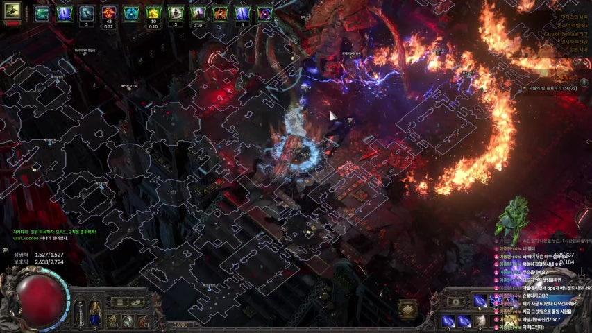 게다가 생명력 흡수량 노드를 찍어도 최대 생명력의 50퍼에서 150퍼를 왔다갔다 하게되어서 끔살 당할 위험이 높습니다(직업 특성 상 최대체력의 200퍼까지 회복 가능) 그래서 저는 패시브 노드에서 모든 피해를 마나로 대신 받는 노드를 찍었습니다. 여기에 에너지 보호막을 마나로 바꿔주는 노드를 찍어서 마나량을 늘리고 마나 100당 주문 피해 3%가 올라가는 노드를 보너스로 챙겼습니다. 이거 하나만 찍어도 제 기준 주문 피해를 30퍼 이상 얻을 수 있어요 원래는 모든 피해를 마나로 바꿔주는 노드를 찍으면 주문 사용시 소모되는 체력도 마나로 대체 되어서 과한 마나소모량 때문에 포기했던 빌드인데, 최근에 패치를 했는지 이제는 저 노드를 찍어도 주문을 사용할때는 체력이 소모되더라구요. 그래서 주문을 사용할 때 줄어드는 체력은 내가 넣은 딜량만큼 체력을 회복시켜주는 생명력 흡수량 노드와 치명타 시 생겨나는 구슬을 먹어서 커버하고, 몹한테 맞아서 받게 되는 피해는 마나로 대신 받음으로써 안정성을 챙기는거죠. 또한 장비에서는 방어력이나 회피 대신 카오스 저항과 최대 생명력, 최대 마나, 에너지 보호막을 골고루 챙겼습니다. 여기에 고유 갑옷 중에 카오스 저항 30퍼를 올려주고 체력의 절반을 에너지 보호막으로 바꿔주는 갑옷을 꼈구요. 원래 에너지보호막을 마나로 바꿔주는 노드 때문에 에너지 보호막이 0이어야 하는데 이 갑옷을 끼면 에너지 보호막이 다시 생겨나며, 생겨난 에너지 보호막 만큼의 마나도 늘어납니다. 즉 생명력이 늘어날수록 생명력의 절반만큼 에너지 보호막과 마나가 늘어나게 되는거죠 저 갑옷 하나만 착용하면 체력 1200, 마나 500의 캐릭터가 체력 600, 에너지 보호막 600, 마나 1100인 캐릭터가 됩니다. 위 수치는 제 60레벨 캐릭터의 수치입니다. 그리거 이 캐릭터가 피해를 받으면 에너지 보호막 600, 마나 1100, 그리고 체력 600의 순서로 피해를 받게 됩니다. 그럼 스킬 난사를 갈겨서 체력이 낮은 상태라고 할지라도 생존률이 올라갑니다. 저는 딜을 위해서 치확 노드를 번저 찍느라 에너지 보호막 관련 노드를 안 찍은 상태인데 100레벨을 찍고 애너지 보호막 노드까지 찍는다면 더더욱 생존력이 올라가겠죠? 근데 이 빌드의 단점은 즉시 회복 마나 플라스크가 필수라는 겁니다. 이게 없으면 몹한테 끔살은 안 당해도 마나가 부족해서 빠져나오지를 못하게 됩니다. 그리고 또 다른 단점은 특정 노드에 너무 의존한다는 것이죠. 그래서 이 빌드가 제 성능을 내려면 적어도 2차 전직을 해서 전직 포인트를 4개 이상 얻어야 합니다. 그래서 블러드 메이지가 2차 전직을 마치기 전까지는 언제든지 끔살 당할 위험을 가지고 있다는게 아쉬운 것 같습니다. 전직 이후부터 2차전직 전까지의 난이도가 너무 높아요
