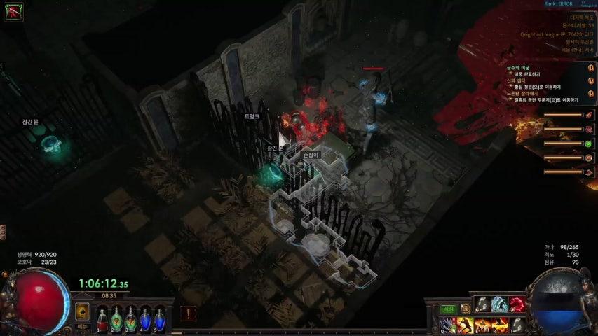 창보커 맵핑과 보스전 매커니즘-15티어 3포탈 맵 입니다. (희귀 경로석) -맵핑 매커니즘 1. 번개창 보조젬- 전압/원시적인병기/갈래 2. 번개창 스킬 자체가 몬스터들 사이 사이를 튕겨다님 3. 여기서 번개창이 격분 충전을 소모하면 복제해서 더 분열함 4. 여기서 연발 사격 버프로 강화 시키고 번개창을 날리면 더 갈라져서 튕겨다님 5. 여기서 연발 사격이 격분 충전을 소모하면 추가로 반복함 6. 여기서 전압으로 더 갈라져서 더 튕겨다님 7. 여기서 갈래로 반으로 갈라져서 2배로 더 튕김 8. 여기서 세마리용으로 다 동결 걸려서 얼음 전령이 광범위 하게 터짐 결과물 ![]() ![]() ![]() ![]() 미친 -보스전 매커니즘 (15초 전후 소요) 1. 폭풍 보주로 격노의 샘을 발동해서 실시간 격노 수급 (폭풍 보주 10초 지속) 2. 족쇄 풀린 화신 버프 해방 (노퀄 9.8초 지속) 3. 연발 사격 + 번개창 날려서 먼저 쿨 돌립니다. (번개창 번개속성으로 삼위일체 1속성 공명 풀) 4. 폭풍의 창 계속 투척 (여기서 보스 동결 -> 치명타시시전 서리구체 냉기속성으로 삼위일체 2속성 공명 차오름) 5. 쿨 돌아온 연발 사격 + 번개창 6. 폭풍의 창 계속 투척 7. 마무리 글로 보면 어려워 보일거 같은데 단순합니다 스킬 하나 깔고 버프 있으면 하나 켜고 연발사격 쿨 오면 번창 한번씩 날리면서 폭창 계속 누르고 있기. 상위 쥬얼리 오브를 아직 하나도 못 발랐습니다; 개인적으로 시즌1 보다 더 잼있네요. 맵핑이 시원 시원해서 스트레스가 다 풀리고 보스전은 손이 좀 가서 딱 좋습니다. 근데 꼬인혀 치확 2퍼 정도 올라갔는데 (13->15) 표기 치확이 10퍼나 오르는군요. 치확 20~23퍼 짜리 쓰면 패시브 엄청 바뀌겠네요