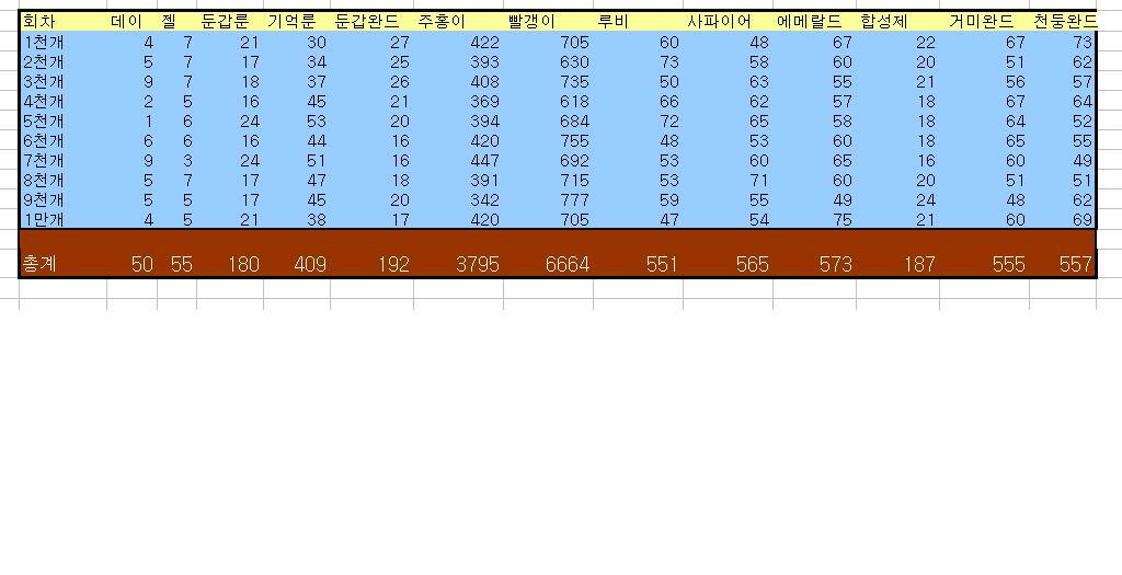 수입 : 데이 52개 약 천만 젤 59개 약 6백만 > 그림에 있는것과 다른것은 표기 오류 및 완료후 제가 몇장 썼습니다. 알타리 3백만 루비 사파이어 에메랄드 대략 550개씩 1650개 165만 기룬 400개 (6천) 240만 둔룬 180개 (4천) 70만 = 2천 4백만