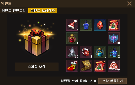 ※ 이벤트 보상상자는 채팅창에 “/이벤트” 명령어를 입력하거나 좌측 하단 R2 메뉴 -> [이벤트] 창 상단 이벤트 인벤토리 탭 우측에서 확인해 보실 수 있습니다. ※ 보유 중인 산타 모자, 산타 양말, 산타 망토, 성탄절 변신 스크롤 I, 성탄절 변신 스크롤 II, 성탄절 트리 장식, 12월의 행운 아이템은 2025년 12월 31일(수) 임시점검 시 일괄 삭제됩니다.