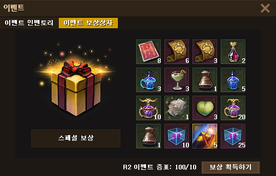 ※ 보상 지급 시점에 캐릭터 삭제, 계정 이전 및 서버 이전된 경우 보상이 지급되지 않습니다. ※ 보상 아이템은 귀속 상태로 지급되며, R2 보관함에서 찾지 않은 보상은 14일 경과 시 자동 삭제됩니다.