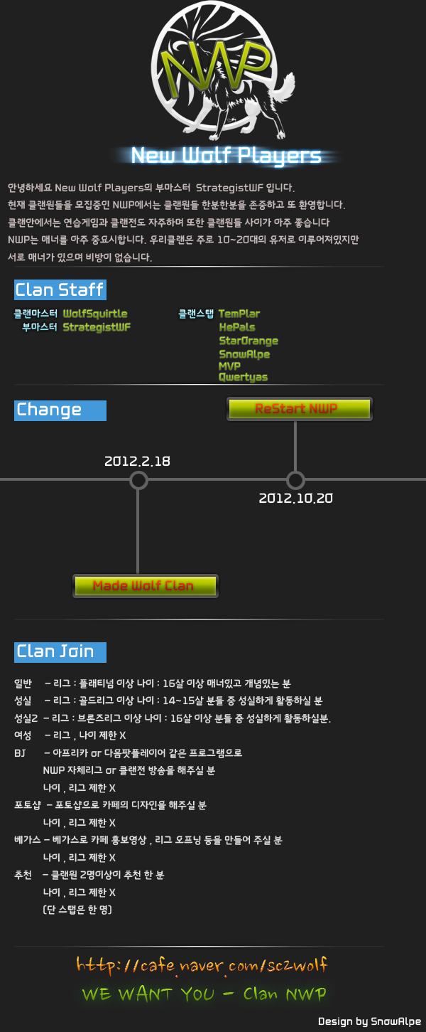 ------------------------------------------------------------------------------------------------------------------- ' We Are New And Forever ' 클랜주소 -- > http://cafe.naver.com/sc2wolf 안녕하세요 현 NWP클랜의 클랜마스터 WolfSquirtle, 인사드립니다. 저희클랜은 WolfClan 으로부터 시작된 클랜으로 2012년 2월 8일 창설되었다가 2012년 10월 20 일 재창설 되어 여러가지 행사들이 준비 . 진행 되고 있습니다. 저희클랜은 WSL Premiere ( 다~마 리그 ) 를 성공적으로 개최 하였으며 일정 금액의 상금도 발송이 되는등 저력이 있는 클랜입니다. 또한 유즈맵을 기반으로 한 WSTL UseMaps League 가 현재 준비중입니다. 저희클랜의 가입제는 다음과 같습니다. ★ 일반 가입제 ★ § 일반제 : 16세 이상 플래티넘 리그 이상 둘다 동시 충족 § 노력제 : 14세 이상 골드리그 이상 / 16세 이상분들은 브론즈 부터 받습니다. --> 1주간의 준회원기간 ※ 준회원 등업은 1 주일간 글 7개 이상 댓글 15개 이상 작성하신 분에 한하여 정식회원으로 등업 되실 수 있습니다. 아닐 경우 바로 강제 탈퇴 됩니다. ★ 특별 가입제 ★ § 능력제 : BJ , 디자인 또는 동영상 제작에 능숙하신분에 한하여 나이는 14세이상 리그는 상관없이 정식클랜원 승인 ( 증거자료 필수 ) § 추천제 : 클랜원 2인 이상의 추천 또는 1인 이상의 스탭&운영진의 추천으로 2주일의 준회원 기간후 정식클랜원으로 승인 ※ 저희클랜은 실력에 앞서 친목을 위해 어느정도 매너를 가지신 분에 한해서는 리그를 브론즈로 설정하여 누구든지 쉽게 가입 하실수 있도록 제도를 갖추었습니다. 저희클랜 운영진&스탭진을 소개합니다. [ 클랜마스터 : WolfSquirtle ] [ 클랜부마스터 : StrategistWF(Wolf) ]