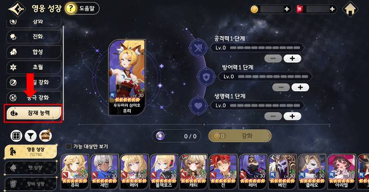 - [영웅 성장] → [잠재 능력] 항목이 추가됩니다. - 영웅 잠재 능력 개방을 통해 영웅의 능력치 [공격력, 방어력, 생명력] 항목별 1~3단계까지 추가 성장이 가능합니다. - 잠재 능력 단계 돌파는 ‘각 영웅의 역할군과 동일한 상급 진화 원소‘를 소모하여 진행 가능하며, 필요 수량은 잠재 능력 단계에 따라 상이합니다. * 영웅 잠재 능력 시스템은 임의 영웅을 6성 + 2초월 달성 시 해금됩니다. - 잠재 능력 강화 진행 시 영웅 등급에 따라 소모되는 재화는 아래와 같습니다.