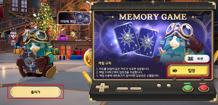 - 미니 게임 [기억력 게임]은 총 12쌍의 카드 중 동일한 카드를 찾는 방식으로 진행됩니다. - 미니 게임 입장 티켓(미니 게임 이용권)은 매일 09:00 (UTC+9) 2개씩 충전됩니다. 미니 게임 진입 후 좌측 하단 돌리기 버튼을 통해 룰렛을 돌려 보상을 획득할 수 있습니다. * 미니 게임 최고 점수는 [이동 횟수, 클리어 시간]과 관계없이 최고 점수를 초과하지 못할 경우, 갱신되지 않습니다.