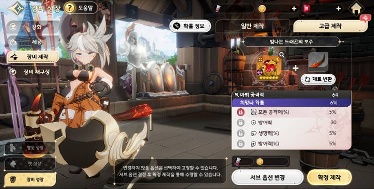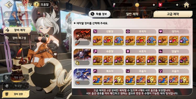 고급 제작은 세트 옵션, 메인 옵션, 서브 옵션을 모두 원하는 옵션으로 선택하여 제작할 수 있는 특별한 제작 방식입니다.