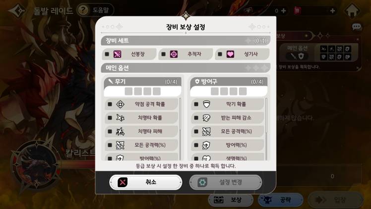돌발 레이드에서는 원하는 세트 옵션과 메인 옵션을 설정할 수 있기 때문에, 아울러 4옵션 장비 역시 더 높은 확률로 드롭됩니다.