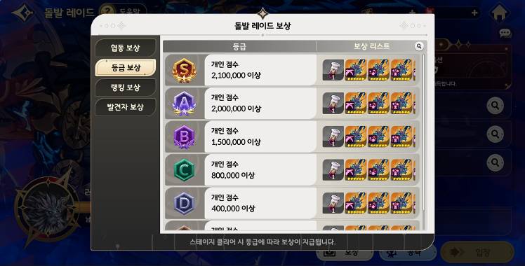 등급 보상: 보스에 도전할 때마다 클리어 등급에 따라 획득하는 보상입니다.