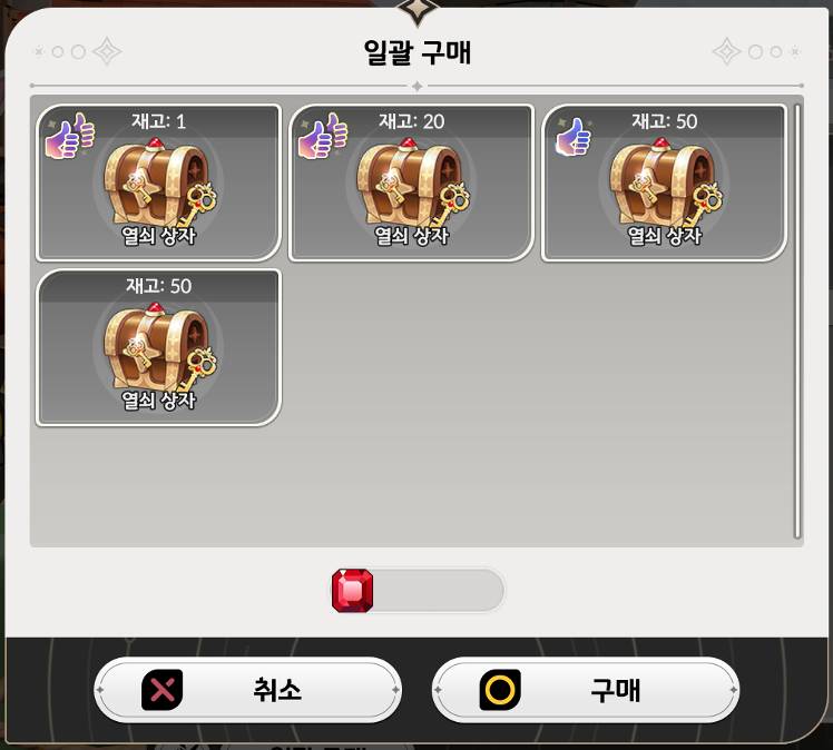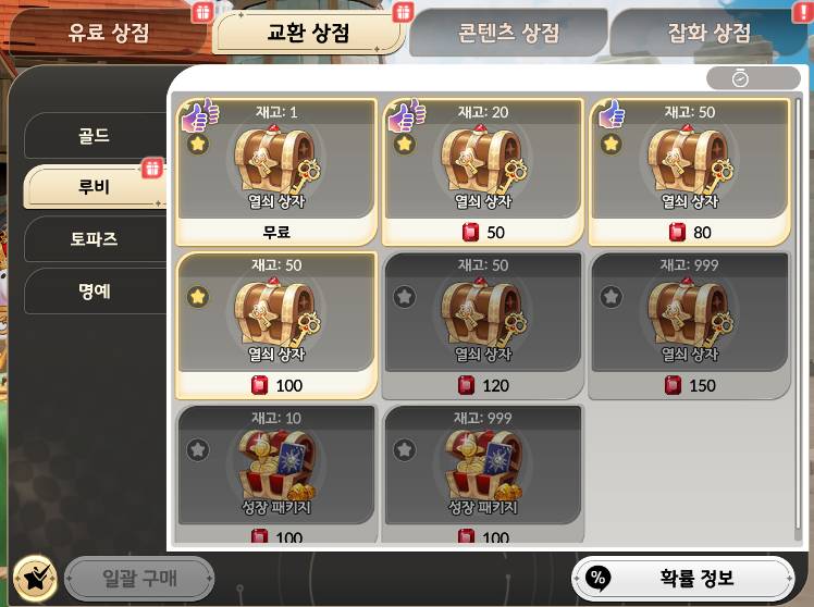 - [상점] → [교환 상점] → [루비]에 일괄 구매 기능이 추가됩니다. - 일괄 구매 설정에 따라 지정된 단계까지의 모든 상품을 일괄 구매 가능합니다. : 일괄 구매 버튼 좌측 일괄 구매 설정 버튼을 이용하여 품목을 지정할 수 있습니다. : 일괄 구매 버튼은 지정된 상품 중 구매가 가능한 상품이 있을 경우 활성화됩니다.