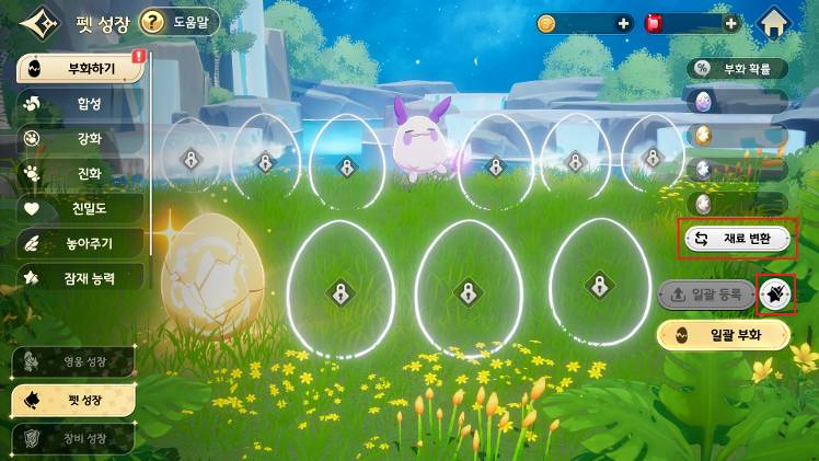 📍 펫 성장 개선 및 펫 조합 품목 추가 - [펫 성장] → [부화하기] 메뉴 내 일괄 등록 설정 버튼 및 재료 변환 기능이 추가됩니다.