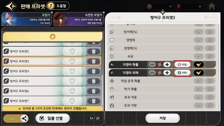 📍 장비 조건 판매 프리셋 개선 - 장비 판매 프리셋의 서브 옵션 상세 필터 내 각 서브 옵션의 강화 수치 범위를 지정할 수 있도록 개선됩니다. - 각 서브 옵션의 강화 수치 조정 후 우측의 버튼은 통해 [이상, 이하] 조건을 설정할 수 있습니다.