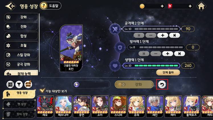 - [영웅 성장] 내 잠재 능력 초기화 버튼이 추가됩니다. : 3종의 잠재 능력(공격력, 방어력, 생명력) 중 하나 이상이 1레벨 이상 강화된 경우에만 초기화할 수 있습니다. : 잠재 능력 초기화 진행 시, 선택한 영웅의 모든 강화 수치 및 단계가 초기화됩니다. 📍 장신구 안전 세공 부적 및 신규 조합 추가