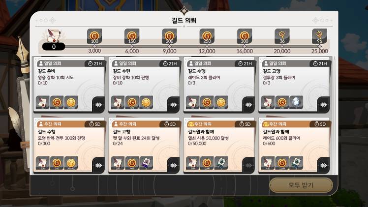 - 길드 레벨 확장에 따라 주간 의뢰(협동) 보상이 상향됩니다. * 각 의뢰별 획득 가능한 주간 의뢰 점수는 길드 레벨 1 ~ 15까지 모두 동일합니다.