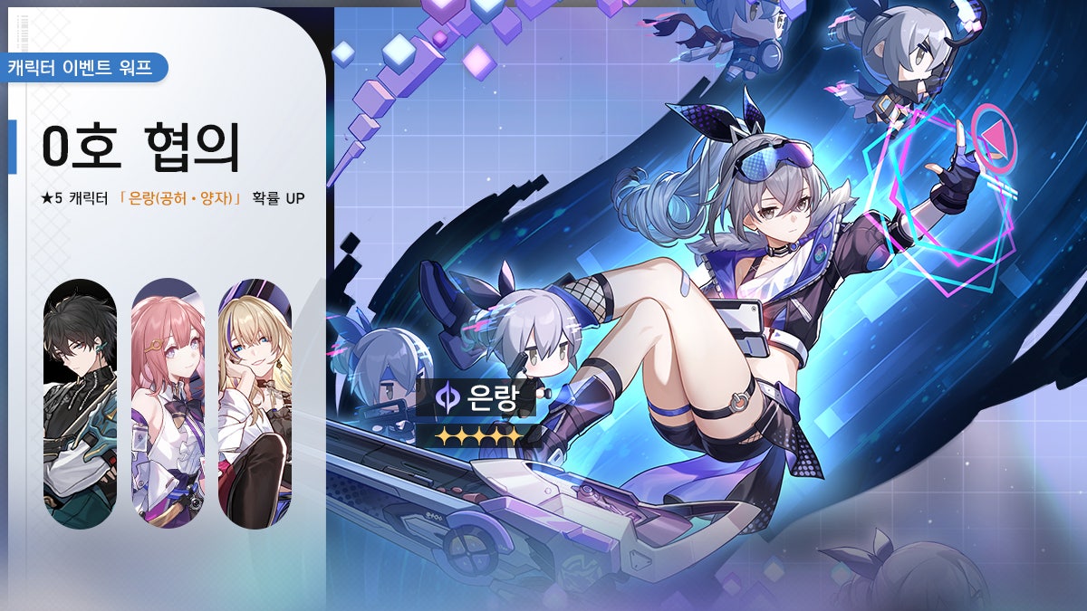 「0호 협의」: 한정 ★5 캐릭터 「은랑(공허•양자)」 확률 UP$ From 은랑 > 원격으로 [0호 협의] 수신 중 > 정보 로딩 중... > [==================================>]100% 로딩 완료 $ 시스템: 정보는 아래와 같습니다 「0호 협의」: 한정 ★5 캐릭터 「은랑(공허•양자)」 확률 UP 이벤트 기간에 한정 ★5 캐릭터 「은랑(공허•양자)」의 워프 성공률이 일시적으로 증가합니다. 「0호 협의」 이벤트 기간에 「별의 궤도 전용티켓」을 사용해 워프할 수 있습니다. ▌「0호 협의」 이벤트 워프 이벤트 기간에 ★4 캐릭터 「단항(수렵•바람)」, 「아스타(화합•화염)」, 「서벌(지식•번개)」의 워프 성공률이 일시적으로 증가합니다. ■ 이벤트 기간 1.1 버전 업데이트 후 - 2023/06/28 12:59(한국 시간) ■ 확률 UP-★5 캐릭터 은랑(공허•양자) ■ 확률 UP-★4 캐릭터 단항(수렵•바람) 아스타(화합•화염) 서벌(지식•번개) ※ 위 캐릭터 중 한정 캐릭터는 「뭇별의 워프」에 추가되지 않습니다. ※ 해당 워프는 「캐릭터 이벤트 워프」로 임의의 「캐릭터 이벤트 워프」에서 ★5 캐릭터를 미획득한 횟수는 「캐릭터 이벤트 워프」에 누적됩니다. 다른 워프의 워프 횟수, 천장과는 따로 계산되며 서로 무관합니다. ※ 자세한 정보는 워프 화면에서 확인해주세요. ▌캐릭터 체험 이벤트 「솜씨 발휘」 참여 조건: 「여정 기록」 오픈 이벤트 기간 1.1 버전 업데이트 후 ~ 2023/06/28 12:59(한국 시간) 이벤트 내용 체험 캐릭터 「은랑(공허•양자)」, 「단항(수렵•바람)」, 「아스타(화합•화염)」, 「서벌(지식•번개)」로 스테이지를 체험할 수 있으며, 도전 성공 시 성옥, 모험 기록, 공용 육성 재료, 신용 포인트 보상을 획득할 수 있습니다. $ 시스템: > 여정의 끝이 뭇별에 닿길