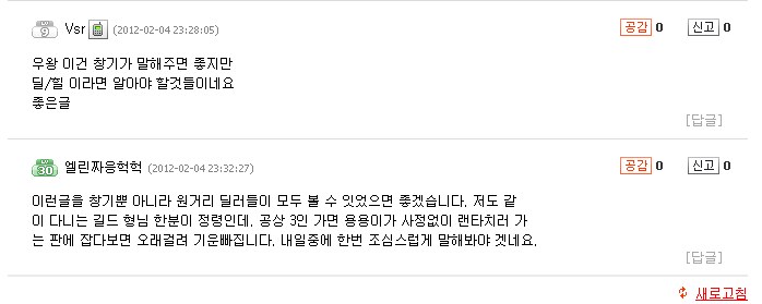 안녕하세요. 포포리 창기사입니다.![]() 안녕하세요. 창기사 게시판에서 온 카라스 서버 포포리 창기사 [우형] 입니다. 타 직업군에 방문할때는 관련 게시판 지기님께 여쭈고 방문해야 함이 마땅하지만, 자유롭게 오픈되어있어 아래와 같은 글을 올림을 감사함으로 양해 말씀드립니다. 이 글로 인해 분쟁의 요소가 야기 된다면, 정중히 사과 말씀 올리고 자삭 하겠습니다. 일전에 창기사 게시판에 8m 법칙에 대해서 글을 쓴적이 있는데요.. 반응이 다소 괜찮은듯 해서 여러 사람이 알았으면 좋겠다 하시는 분도 일부 계시고 해서 수고스럽지만 원본의 내용을 일부 발췌하여 각색하고 게시판 내용에 맞게끔 수정하여 글을 올립니다. 글을 쓰기 이전에 당부의 말씀을 드립니다. 이 Tip 글은 이전에 이미 밝혀진바 있는 사실일 수도 있으며 중복 글일 수도 있음을 양해 부탁 말씀 드립니다. 또한, 이 글은 여타 사실과 다소 차이가 있을 수 있으며, 여러 사람이 보는 게시판이므로 의견차이가 생길 수 있음을 미리 밝힙니다. 어디까지나 [카라스]서버 - [유나이티드] 길드 소속 - 포포리 창기사 [우형]의 직접 겪음과 체득함으로 경험과 사실에 근거합니다. 감사합니다. 덧붙여, 제가 하는 이야기는 옳고 그름이 있음을 밝힙니다. 제가 하는 이야기가 맞는 부분도 있고, 맞지 않는 부분도 있음을 알립니다. - 상황 대체로 도발 후, 어글이 제대로 들어갔음에도 불구하고 가장 멀리 있는 힐러 혹은 법사님을 타겟으로 이동하여 맹공격을 퍼붓는 일반몹, 혹은 중형몹이 있을 줄로 압니다. - 결과 (어디까지나 상황설정이고, 픽션과 허구에 근거합니다) 힐러 사망, 법사 사망 그 당시 그 파티의 "창기사"를 향한 힐러님과 법사님의 원망섞인 한마디 : "어글 좀 잡아요. 도발 안해요?" 그럼 이어지는 창기사의 답변 : "니가 창기해라." 혹은 "이상하네 어글 분명히 먹었는데;; 죄송해요" 혹은 "오늘 컨디션이 영 아니네" 기타 등등의 여러가지 답변이 예상됩니다. - 해결책과 일반몹, 중형몹의 예시 그렇다면 왜 이런 현상이 벌어지는것일까요?! 그것은 바로, 8m 법칙에 있습니다. 좋은 예시를 들어드리겠습니다. 일반몹과 중형몹의 예시가 있는데요. - 일반몹의 경우 일반몹의 경우, 어느곳에서나 통용되는 사실이지만 검의 탑(상급) 첫번째 구간에서, 개와 개주인이 있습니다. 보통은 두마리먼저 잡고, 진행하거나 숙련팟 일 경우, 개와 개 주인을 끌고 안으로 파고들어 입구들어 가자마자 바로 3시방향 구석으로 벽탱 후 방패치기-반찌-도발-방연-도약-맹타-반찌-도발(저의 적대치 써클입니다) 각종 적대치 기술을퍼 붓는것이 정석(?!)인데요. 이때, 창기사가 해줄 수 있는 가장 좋은 안내멘트는 벽탱 후 후딜 부탁드립니다. 탱으로부터 8m를 유지하지않으시면 잡몹도 랜타갑니다 (특히 법사/원딜님 주의)입니다. 왜냐하면, 실제로도 그렇듯이 원딜님들이 탱으로부터 8m를 유지해주시면 랜타가 가지않고 어글을 유도하는 기술이 많은 창기사에게 몹들의 이목이 집중됩니다. 그래서 후딜로써 데미지를 +@ 할 수 있고, 빠르고 안정적인 진행이 가능하지요. 하지만, 이와 같은 명시없이 딜러분들이 벽탱을 시전한 탱으로부터 몹이 붙었는데, 분명히 도발로 어글을 제대로 넣었지만, 어글이 제대로 박힌 몹들은 창기를 보지않고, 멀리 떨어져있거나, 뒤늦게 오시는 분들을 향해 몹이 달려갑니다. 죽이려구요-_-; 그럼, 어김없이 창기에게 이런 말이 날아옵니다. 도발 안하세요? 어글 안잡아요? - 중형몹의 경우 공포의 미궁(상급) 3네임드 용용이.. 익히 아시는 네임드라고 생각됩니다. 이 몹의 특성은 1. 대체로 제자리에서 뺑그르르 돌면서 근딜들을 자빠뜨리는 기술 2. 혹은 머리통으로 탱치는것 3. 입에서 불떵이 뱉으면서 뒤로 날아가는것 4.혹은 앞으로 날아오면서 전진공격하는것 5. 혹은 빨간 장판(디버프 저주), 파란 장판(디버프 저주) 입니다. 빠진 특징도 있지만, 그것은 봐주세요.. (기억이 안나요ㅠㅠㅠ) 이 몹을 잘 잡는 방법은 딱 하나만 알면 됩니다. 너무 잘 알려져서 꺼내기도 부끄러운 방법인데요. 딱 탱으로부터 8m만 유지해주시면 용이 얌전해집니다. 그러나 나 죽는다고 계속 탱으로부터 멀어지고 8m 이상 벗어나면 랜타를 갑니다. 그럼 용이 자꾸, 움직이고 딜로스가 생깁니다. 잡는 시간이 오래 걸리고 피로가 누적됩니다. 스트레스가 생기고, 욕이 나오고(...) 내부분열이 일어나면서 파티가 해산이되고, 사사게에 글이 뜨고 누가 잘못했느니 잘했느니 고성(?)이 오가며 의견을 대립.. 갈등.. 하아(한숨) 잠시 또 삼천포로 빠졌는데요.. 어쨌든 이 8m 만 유지해주시면, 용이 얌전해지고, 쉽게 공포의 미궁(상급) 2네임드 용용이를 잡을 수 있게 되는 것입니다. - 결과도출 (서론, 본론) 일반몹이든 중형몹이든 어떤 몹이든 상관없습니다. 다만 몹의 특성과 상황을 고려하여 벽탱하는 지점으로부터 혹은 무빙탱 하는 지점으로 부터 유동적으로 각 파티의 구성원으로 부터 단결되어지고 합심하여 탱으로부터 8m 안쪽으로만 유지를 해주시면, 몹은 얌전해지고, 적대치를 유지하는 탱만 보게 될 것이며, 힐 어글로 인한 랜덤어택 또 한 가지 않게 될 것이며, 수월하고